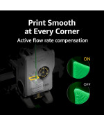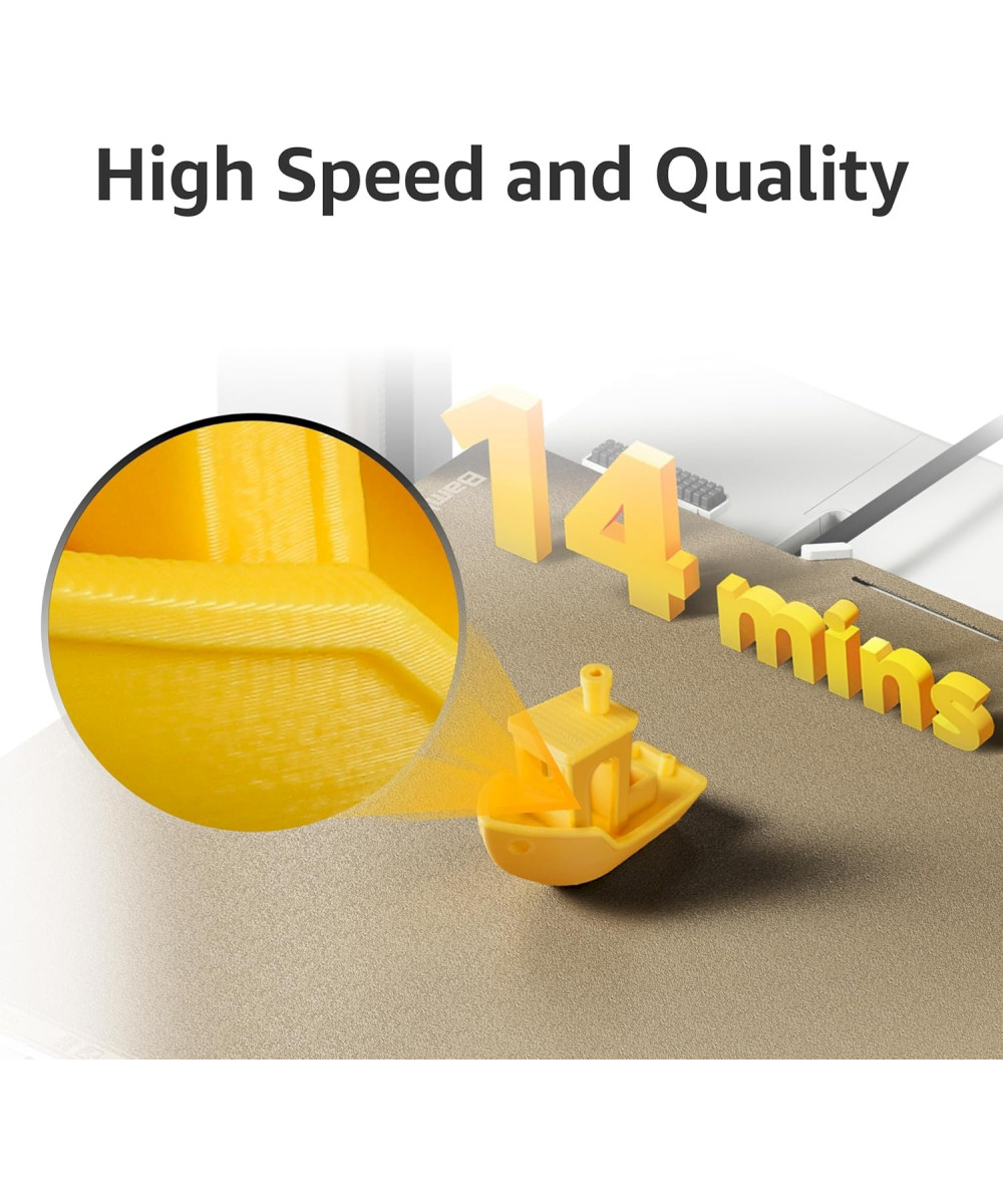 Metallschienen, stabiler Rahmen, Düsendrucksensor, Beschleunigungsmesser, leistungsstarke MCU und vor allem ein fortschrittliches Bewegungssteuerungssystem, das all diese Funktionen nutzt, um direkt nach dem Auspacken ein 14-minütiges Benchy in perfekter Qualität, ohne spezielles Filament, zu drucken und dabei alle Speedbenchy Regeln zu befolgen.
