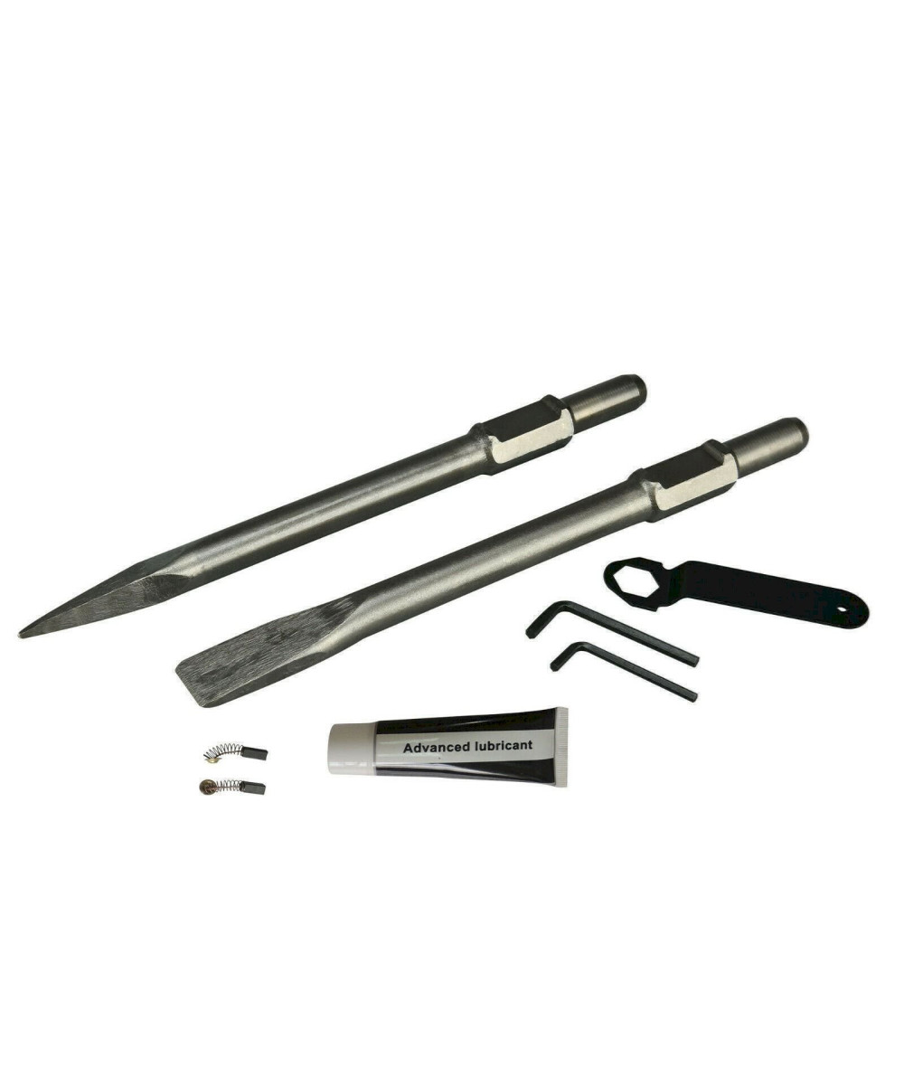In der Lieferung ist ein Koffer mit Rädern - für den einfachen Transport - mit enthalten. Inklusive Spitz- (30 x 410 mm) und Flachmeißel (30 x 410 mm). Außerdem ist das Öl zum Auffüllen und ein Verschluss für den Zusatzgriff inklusive.