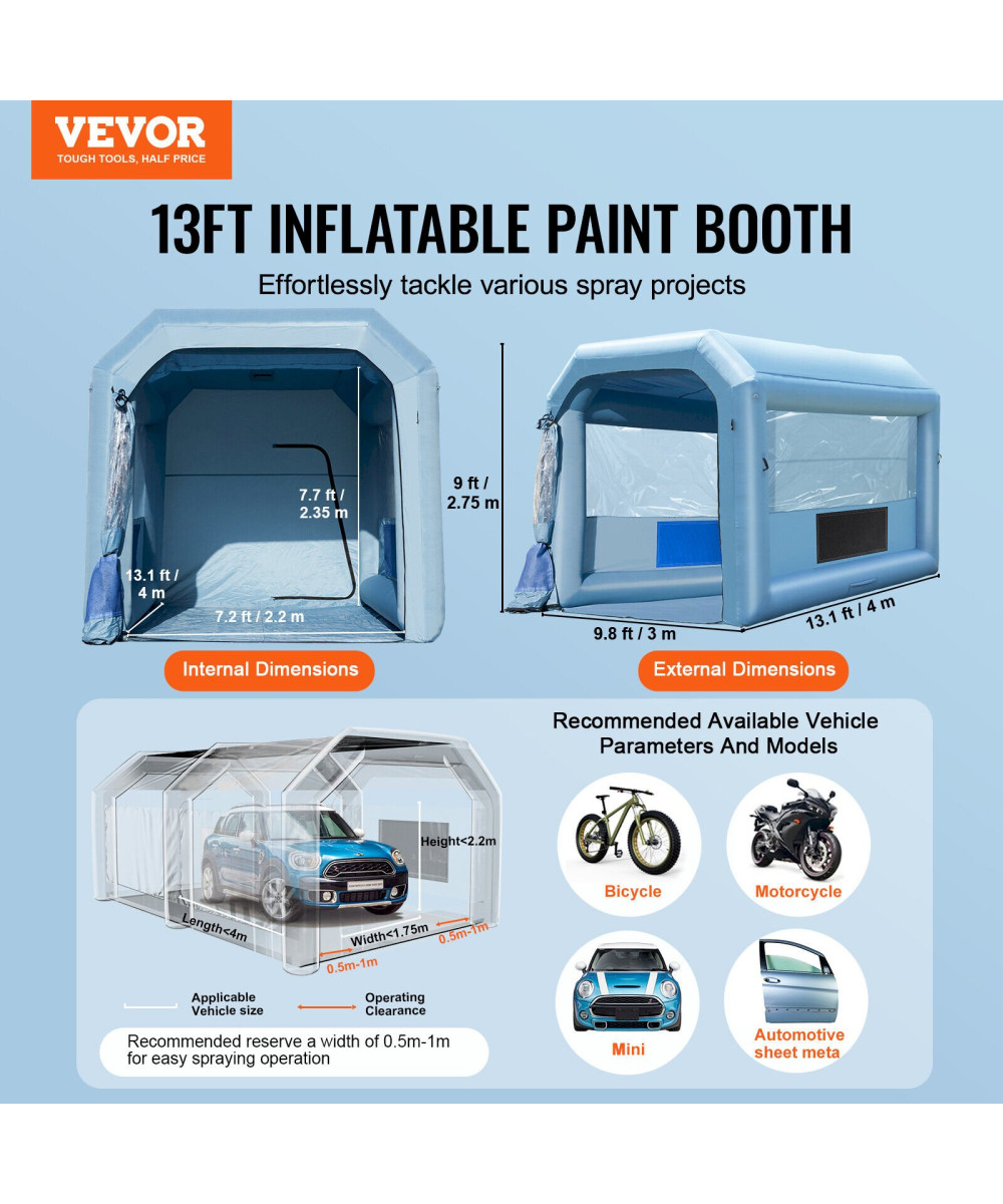 Vielseitig einsetzbar: Die tragbare aufblasbare Lackierkabine (13 Fuß / 3,9 m) eignet sich zum Lackieren und Reparieren von mittelgroßen Möbeln, Metallprodukten, Autoteilen, Fahrrädern, Motorrädern und Kleinwagen wie Toyota Corolla und Honda Civic. Sie kann auch als temporärer Raum für Ausstellungen, Camping und medizinische Versorgung genutzt werden.