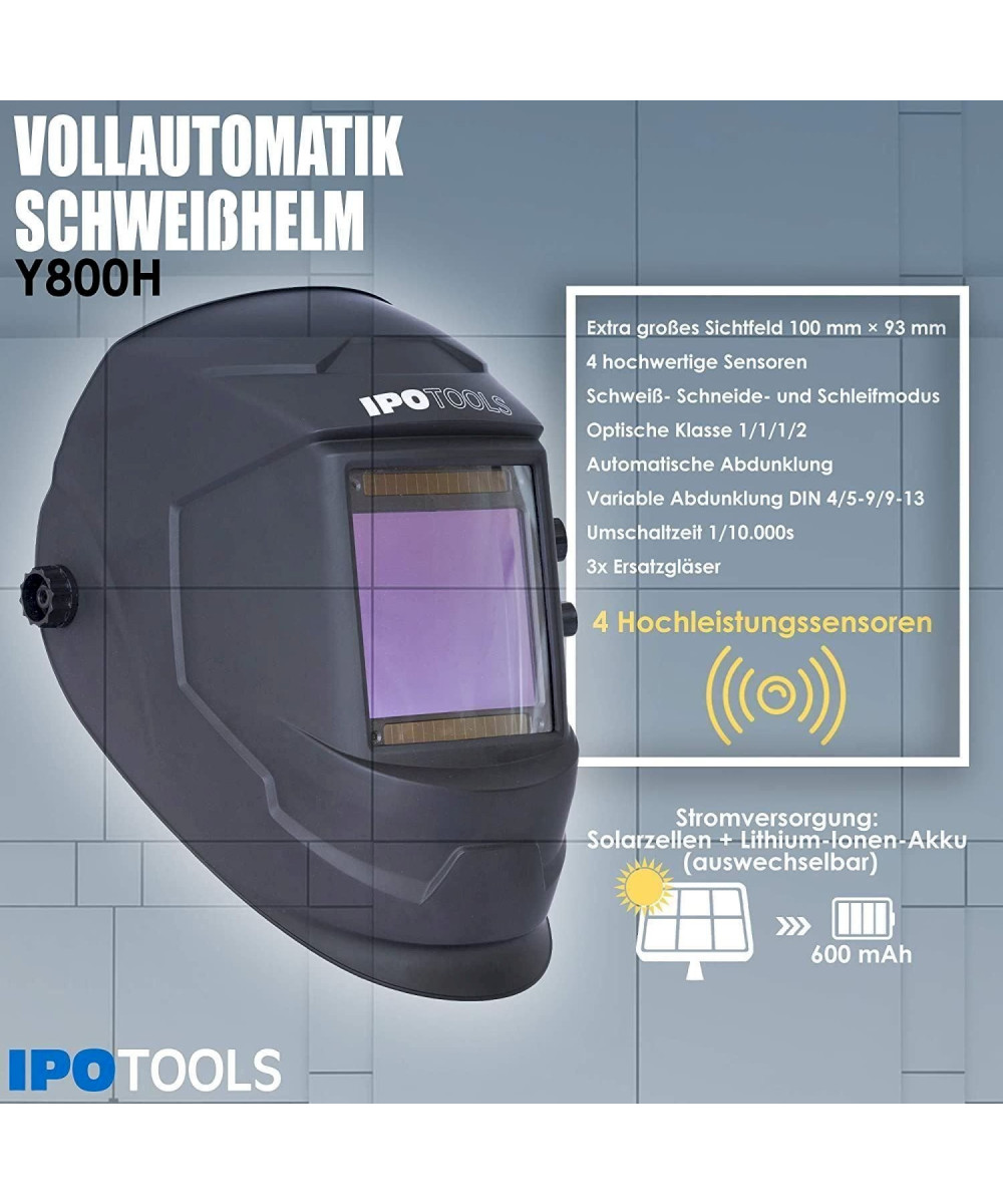 IPOTOOLS LY800H Automatik Schweißhelm, 4 hochwertige Sensoren, extra großes Sichtfeld, Volleinstellbar, Solar