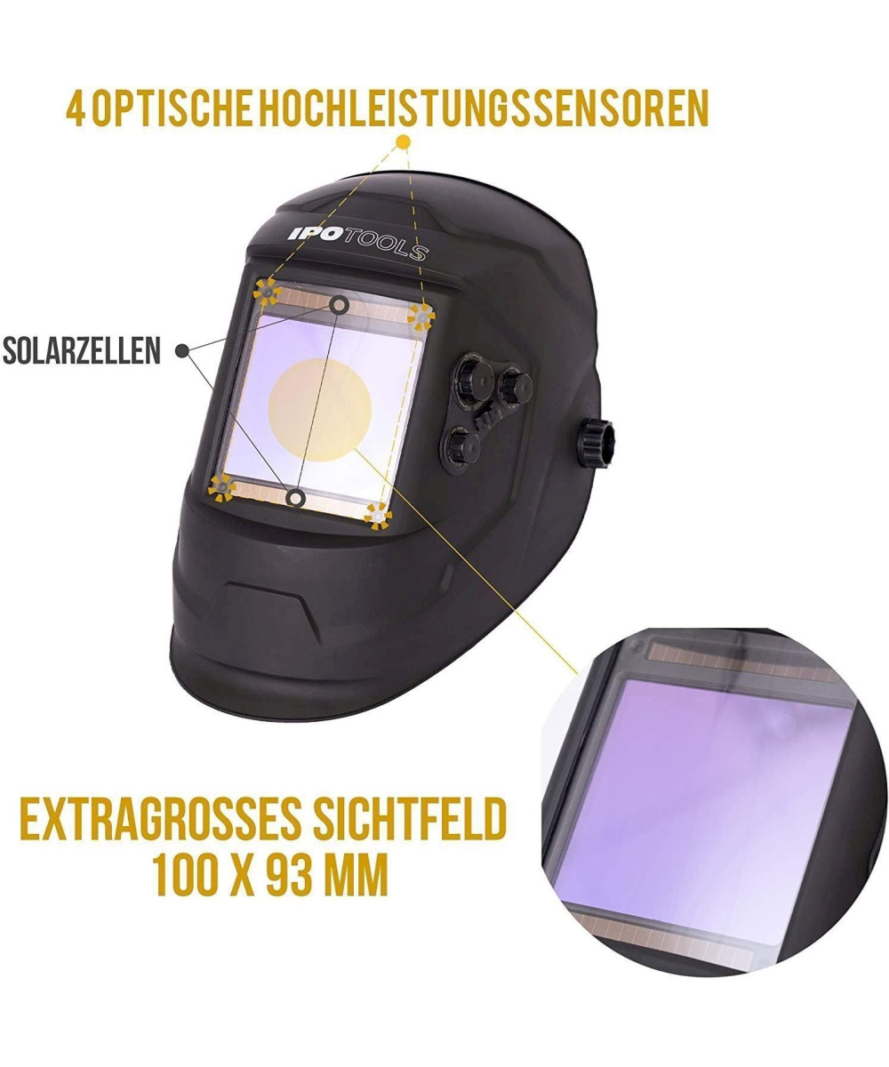 Mit dem extragroßem 100 x 93mm Sichtfeld, bietet Ihnen die extraleichte und robuste IPOTOOLS Schweißmaske klare Sicht auf Ihr Werkstück, Ihr Blickfeld wird deutlich vergrößert wobei Ihr Kopf, Gesicht und Augen stets einen andauernden Schutz vor Funken, Spritzern und Hitze genießen. Besonders hoch ist die Schutzfunktion für Ihre Augen, da die Schweisshelm Automatik die IR- und UV-Strahlen perfekt abschirmt. Die Schutzstufe bleibt dabei in allen Einstellungen gleich, auf höchstem Niveau. - 4 hochwertige Sensoren (freihand Automatik)