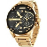 gold ionen-plattiertes Edelstahl-Gehäuse, verschraubter Boden, Lünette mit Zierschrauben, Mineralglas, wasserdicht geprüft bis 3 bar, Durchmesser 57 mm, Höhe 13,5 mm, gold ionen-plattiertes Edelstahlband, Faltschließe mit Sicherheitsdrücker, präzises Quarzwerk mit 4 Zeitanzeigen, schwarzes Zifferblatt, Datumsanzeige, Stoppuhr mit 1/1 Sek. bis 30 Min, 24-Stunden-Anzeige, polierte Leuchtzeiger