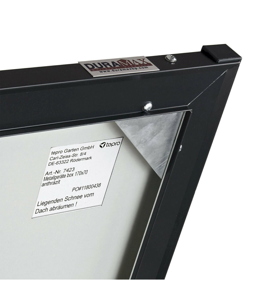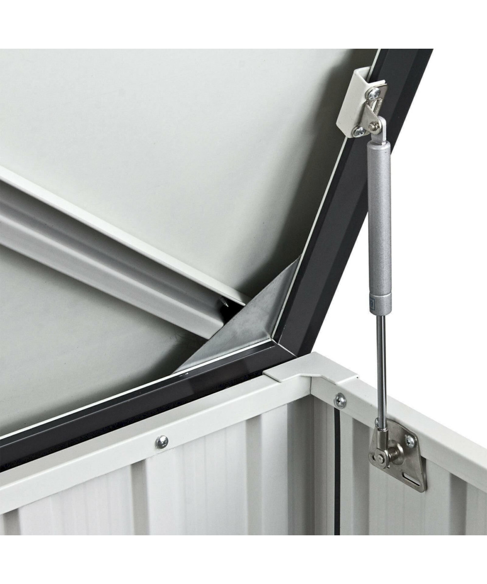 Original Tepro Metall-Gerätebox 170x70 cm anthrazit/weiß. Schöne Aufbewahrungsbox aus Metall - ideal zur Aufbewahrung für alle Utensilien in Haus und Garten. Ob Stuhlauflagen, Gartengeräte, Spielsachen oder andere Gartenaccessoires - alles lässt sich einfach und sicher in der geräumigen und stabilen Box verstauen. Sie ist, durch die positiven Materialeigenschaften des verzinkten Stahlbleches, sehr lange haltbar und praktisch wartungsfrei. Die besondere Pulverbeschichtung schützt dabei zuverlässig vor Korrosion. Der leichtgängige, aufklappbare Deckel mit 2 Gasdruckfedern macht das Verstauen von Gegenständen mühelos. Auch die vorhandene Vorrichtung für ein Schloss unterstreicht den praktischen und zweckdienlichen Charakter. Somit eine komfortable Lagerlösung, die langjährige Begeisterung verschafft.