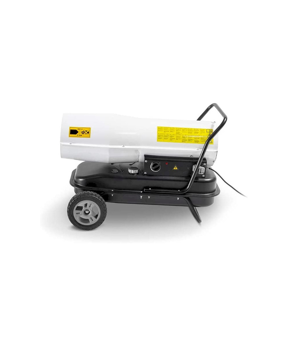 Durch sein strapazierfähiges, doppelt lackiertes Gehäuse, getragen von einer leichtgängigen Fahrwagenkonstruktion mit Kabelaufnehmern und installiertem Kraftstofftank, ist dieses Ölheizgebläse für Beheizungseinsätze in Außenbereichen bestens präpariert und kann per Thermostat problemlos im vollautomatischen Dauerheizbetrieb eingesetzt werden.