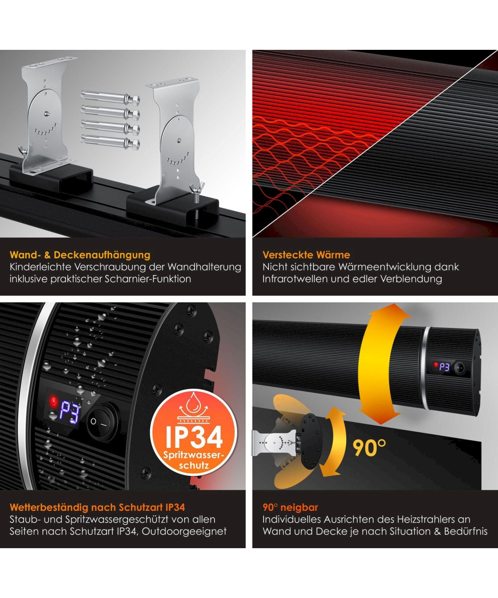 Durch die Infrarot - Röhre wird die Leuchtwirkung des Heizstrahlers auf ein Minimum reduziert , sodass Sie Ihren Abend auf der Terrasse genießen können . Der Wand - Heizstrahler ist mit Schutzklasse IP34 gegen Staub und Strahlwasser geschützt .