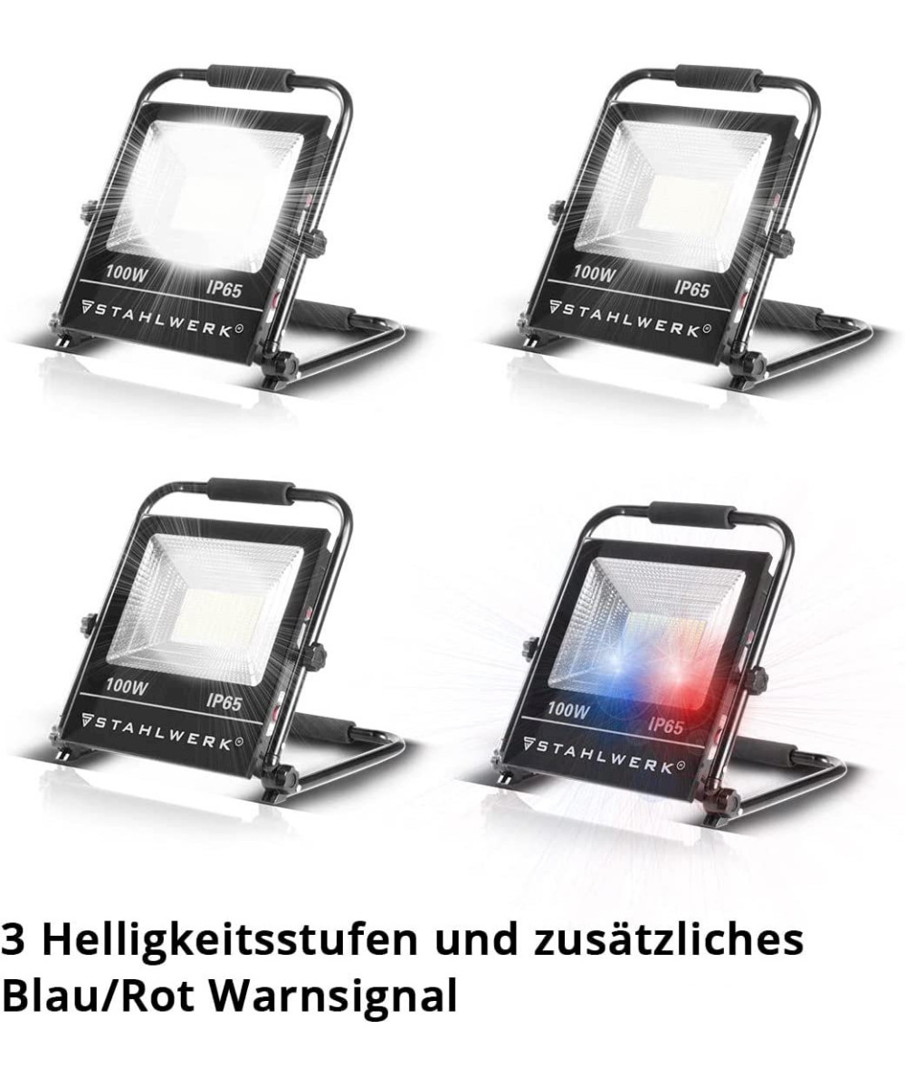 Der leistungsstarke STAHLWERK LED Solarstrahler LSL-100 ST überzeugt mit 100 Watt Leistung und ist die ideale Alternative zu kabelgebundenen Leuchten. Die 191 Hochleistungs-LED-Dioden mit Epistar-Chip und ein integrierter Reflektor sorgen für eine extrem hohe Lichtausbeute bei einer Farbtemperatur von 6.000-6.500 Kelvin. Mit der LED Solarleuchte lassen sich Räume perfekt ausleuchten. Der energieeffiziente 3,7 V Akku mit 11.000 mAh ist optimal auf die leuchtkräftigen LEDs abgestimmt und bietet langanhaltend Beleuchtung. Aufgeladen wird der Hochleistungs-Akku mit einem im Lieferumfang enthaltenen USB-Kabel oder das Solarpanel. Der praktische USB-Anschluss kann Smartphones, Tablets etc. laden und ersetzt eine leistungsstarke Powerbank. Das Solarlicht verfügt über drei Helligkeitsstufen, ein blau-rotes Warnsignal und einen Automatik-Modus, welcher die LED Leuchte bei Dunkelheit einschaltet. So kann die Helligkeit individuell auf die erforderlichen Bedürfnisse vor Ort abgestimmt und selbst bei schlechten Lichtverhältnissen ausreichend Licht geschaffen werden. Der Rahmen ist aus hochwertig lackiertem Metall und verfügt über zwei ergonomische Griffe aus Moosgummi. Das stabile Kunststoffgehäuse bietet hohe Stabilität und ist nach Schutzklasse IP65 stoßfest und spritzwassergeschützt. Der LED Baustrahler lässt sich zusammenklappen und leicht verstauen. Die Solarleuchte eignet sich überall dort, wo eine Lichtversorgung unabhängig von der nächsten Stromquelle benötigt wird, wie zum Beispiel auf der Baustelle, bei Renovierungsarbeiten, in der Werkstatt, beim Camping, in Schrebergärten, auf Festivals uvm.