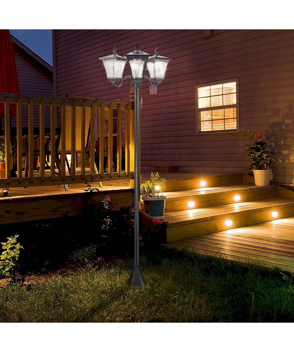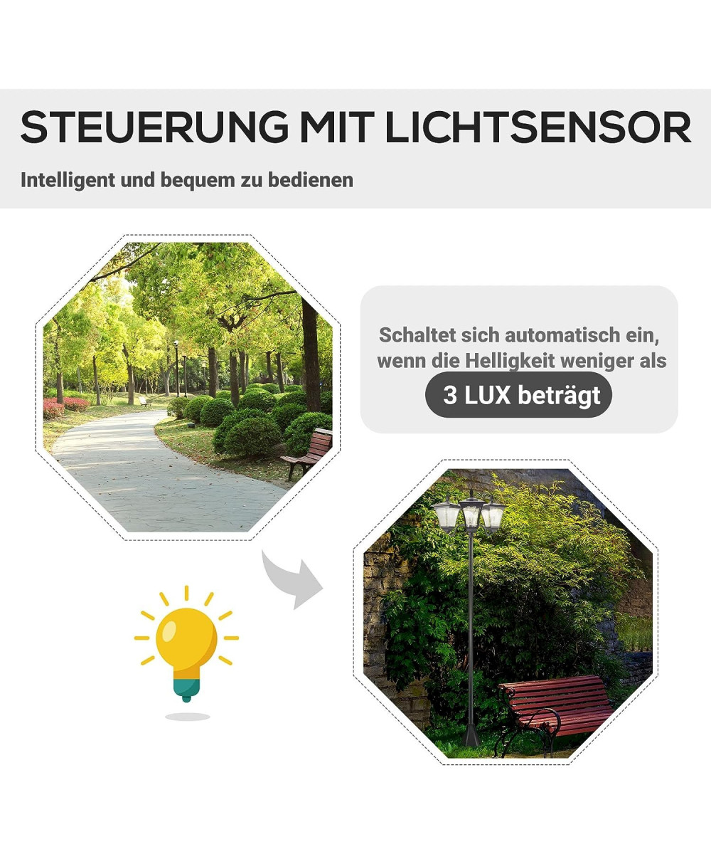 Die Outdoor Pfostenlampe mit 3 Solarleuchten von Outsunny verfügt über ein abnehmbares und dimmbares LED-Licht und einen automatischen Lichtsensor für bequeme Beleuchtung bei Nacht. Die energiesparende Gartenlampe kann bei voller Solarladung bis zu 6 Stunden leuchten. Die wasserfesten Materialien und der schicke Stil machen die Solarleuchte zu einer idealen Ergänzung für Ihre Gärten, Wege, Terrassen, Decks, am Pool und so weiter.