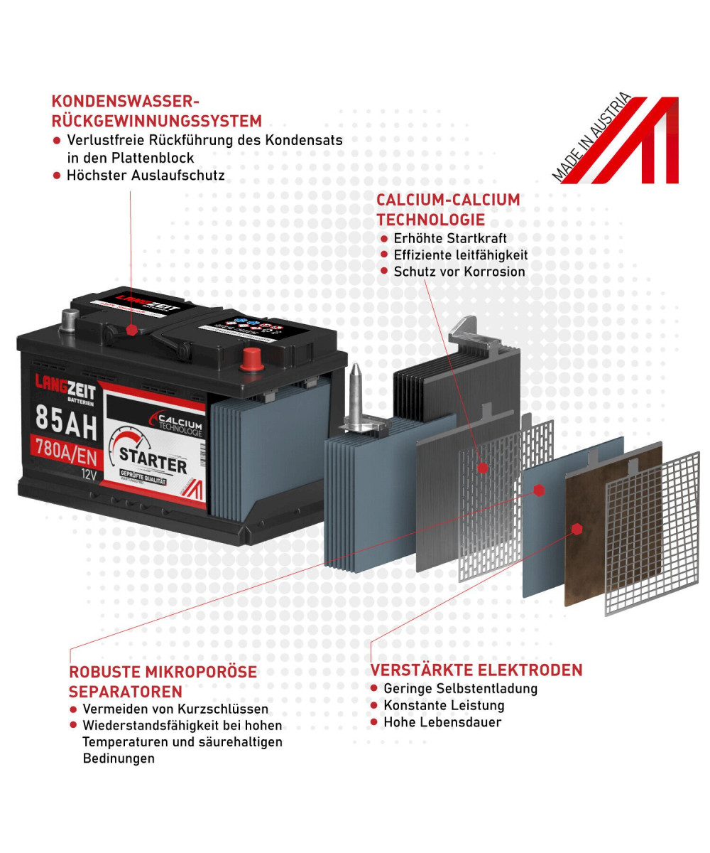 Die LANGZEIT Autobatterie bietet dank CALCIUM-CALCIUM Technologie ausgezeichnete Kaltstartleistung und eine hohe Kapazitätsreserve. Die Batterieserie entspricht den höchsten Anforderungen der Automobilindustrie. Die sehr hohe Fertigungtechnik, gleichbleibend hohe Qualität und die lange Lebensdauer zeichnen diese Batterie aus. Diese Starterbatterie der Premiumklasse ist optimal geeignet für Fahrzeuge mit sehr hohem Leistungsanspruch und bewährt sich auch auf Kurzstrecken und in Dieselfahrzeugen.