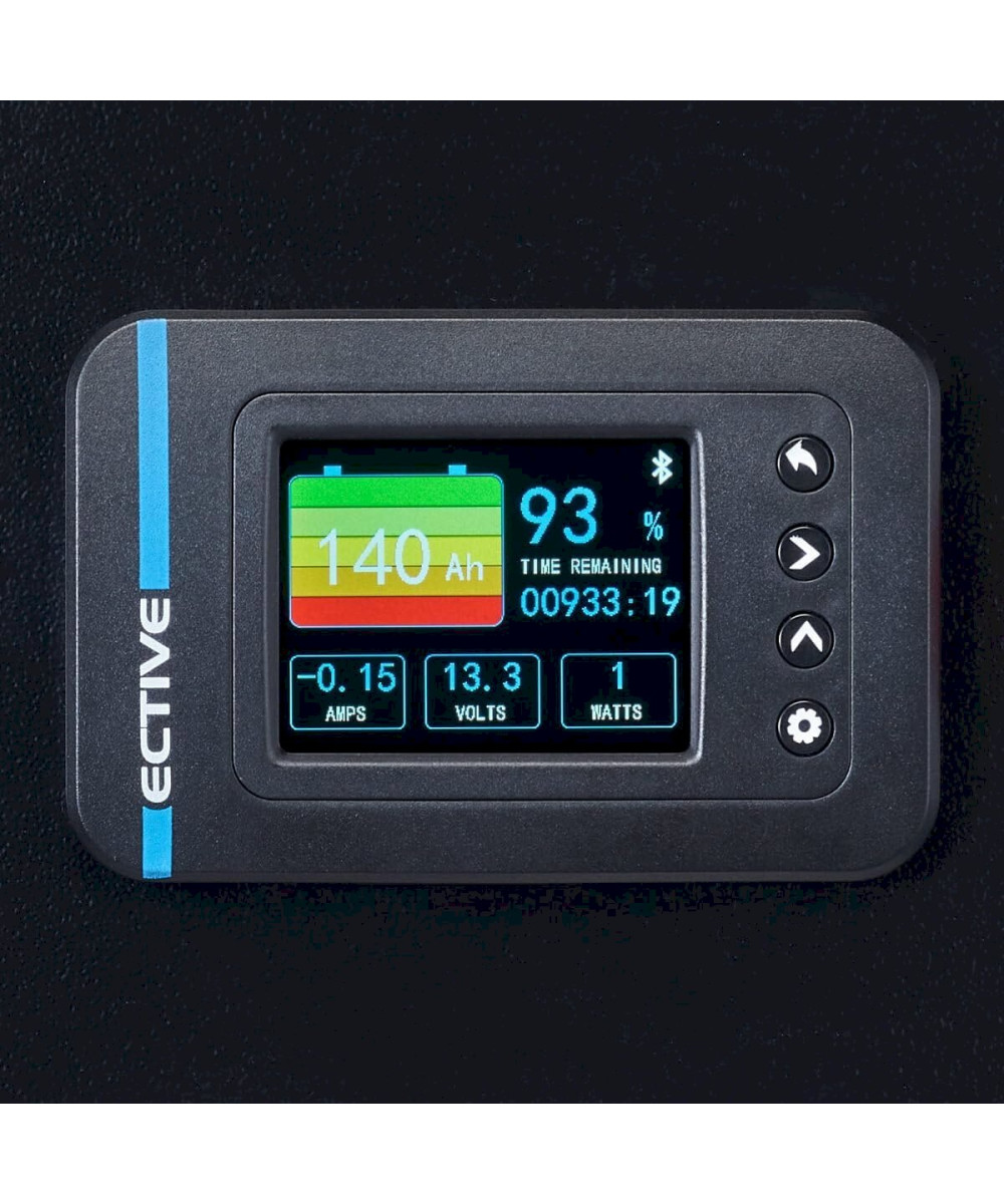 Über das LCD-Farbdisplay können Sie sich zu jeder Zeit über den Zustand Ihrer ECTIVE LC Under Seat BT informieren. Die übersichtliche Anzeige verrät Ihnen auf einen Blick die Restkapazität mit dem entsprechenden Ladestand in Prozent, sowie der verbleibenden Zeit, bis die LC Under Seat BT unter ihrem momentanen Energieverbrauch leer ist.