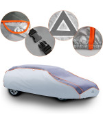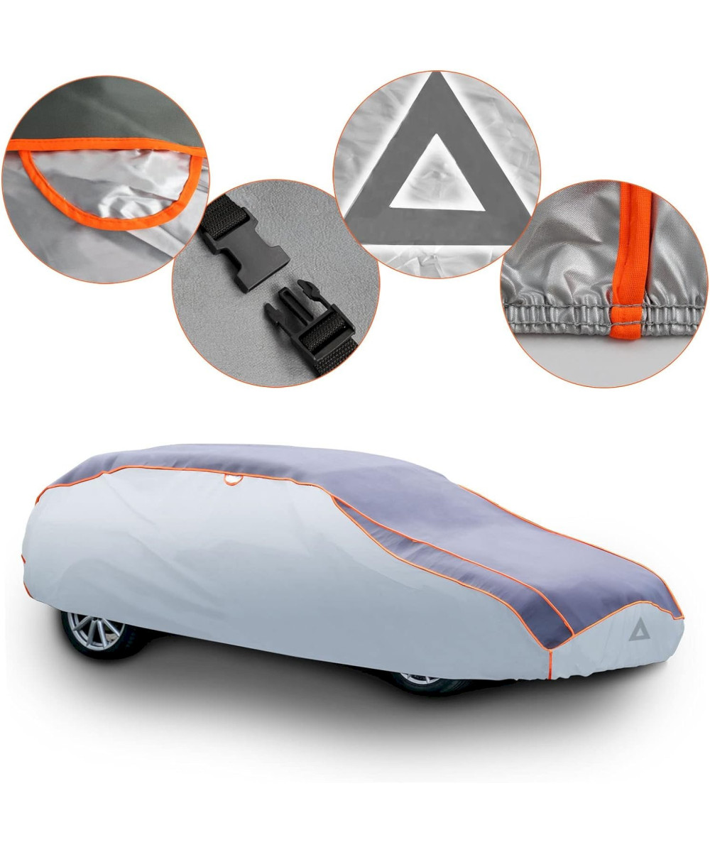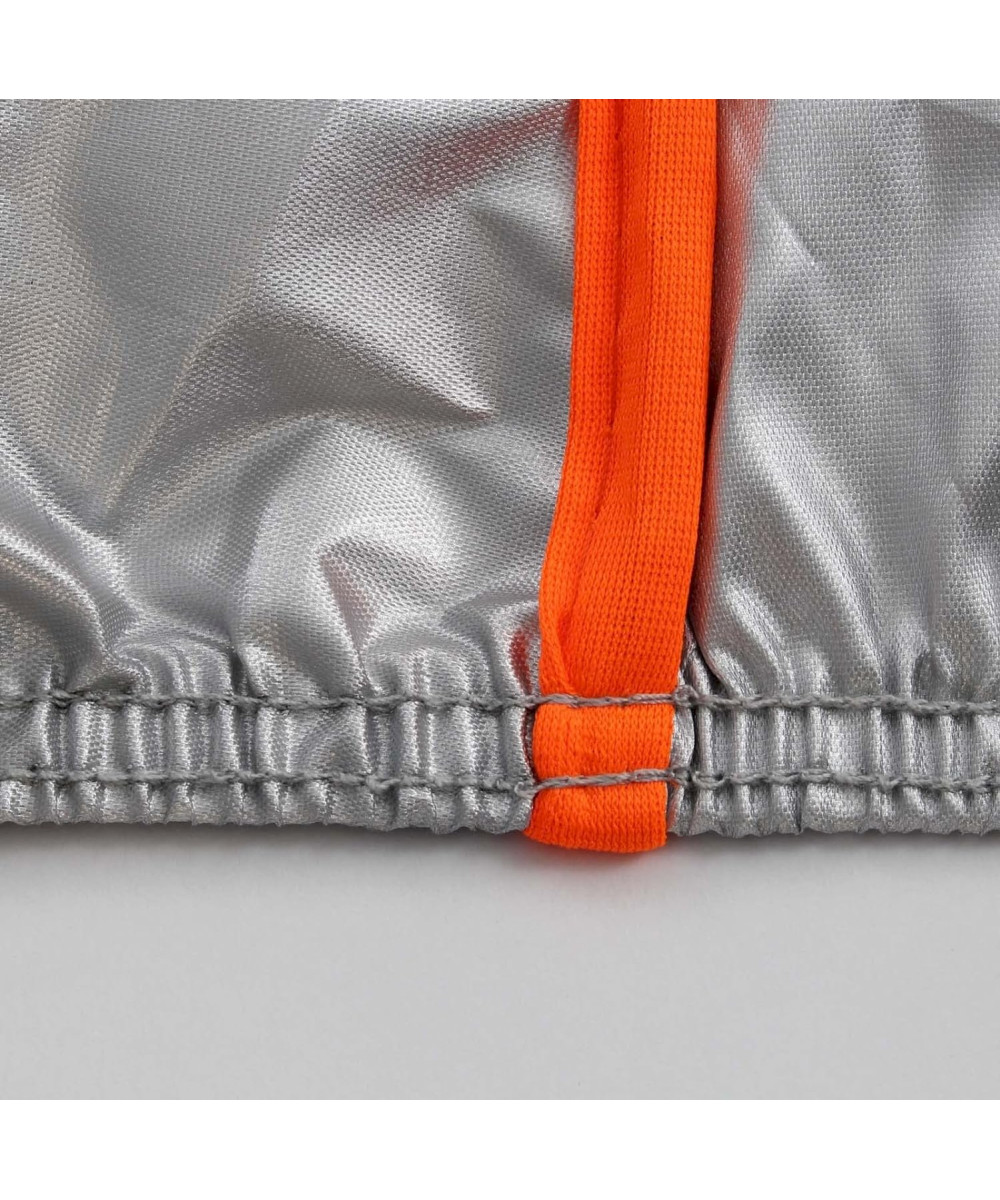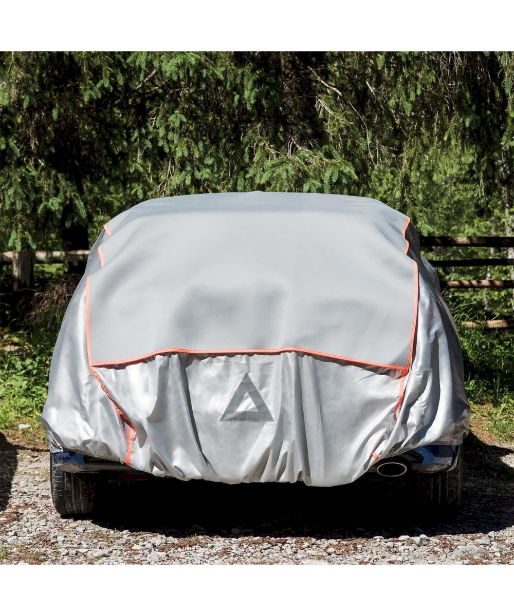 Zwei Belüftungsöffnungen in der Autoabdeckung sorgen für Luftzirkulation, so dass sich kein Kondenswasser unter der Autoplane bilden kann. Zwei aufgenähte Reflektoren in Dreiecksform auf Vorder- und Rückseite sorgen für bessere Sichtbarkeit in der Dämmerung.