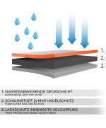 Die Oberseite der Hagelschutzgarage besteht aus drei Materialschichten: Der wasserabweisende Oberstoff verhindert, dass ihr Auto immer wieder dem Regen ausgesetzt ist. Die 4 mm dicke Schaumstoffschicht (EVA) schützt die Motorhaube, die Windschutzscheibe und das Autodach vor Hagelschlag. Der Innenstoff besteht aus lackschonendem Vlies. Die Seitenteile der Ganzgarage sind aus reißfestem und witterungsbeständigem 150D-Oxford-Polyester gefertigt.