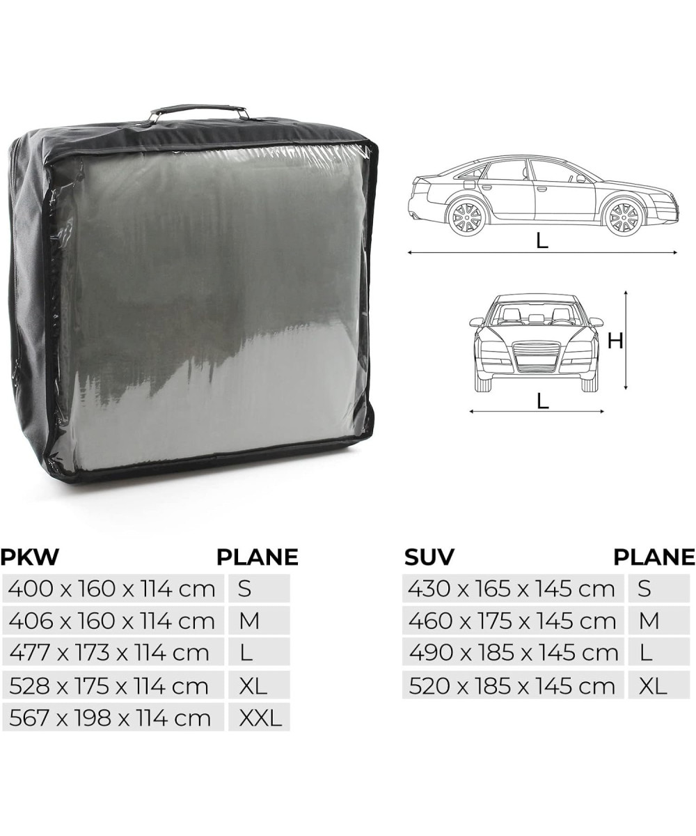 Die universelle Schutzhülle hat eine Größe von 431 x 165 x 119 cm und ist daher vor allem für kleinere Pkw geeignet.