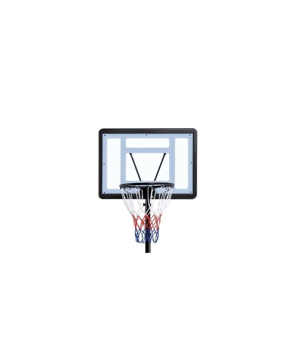 Material: pulverbeschichtetes Metall(Stützen), Kunststoff (PVC und PE) (Standfuß und Basketballbrett) und Nylon(Korbnetz)