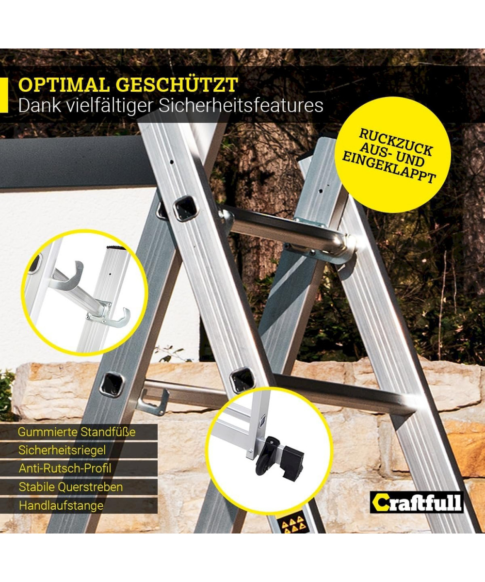 Sicherheit ist eine Konstante, auf die Sie sich bei jedem Einsatz des Craftfull Leitergerüst CF-103A verlassen können. Ein spezielles Anti-Rutsch-Profil, gummierte Standfüße, Sicherheitsriegel und Querstreben sorgen dafür, dass sich dieses Leiter-Gerüst in jeder Funktion maximal sicher verwenden lässt.