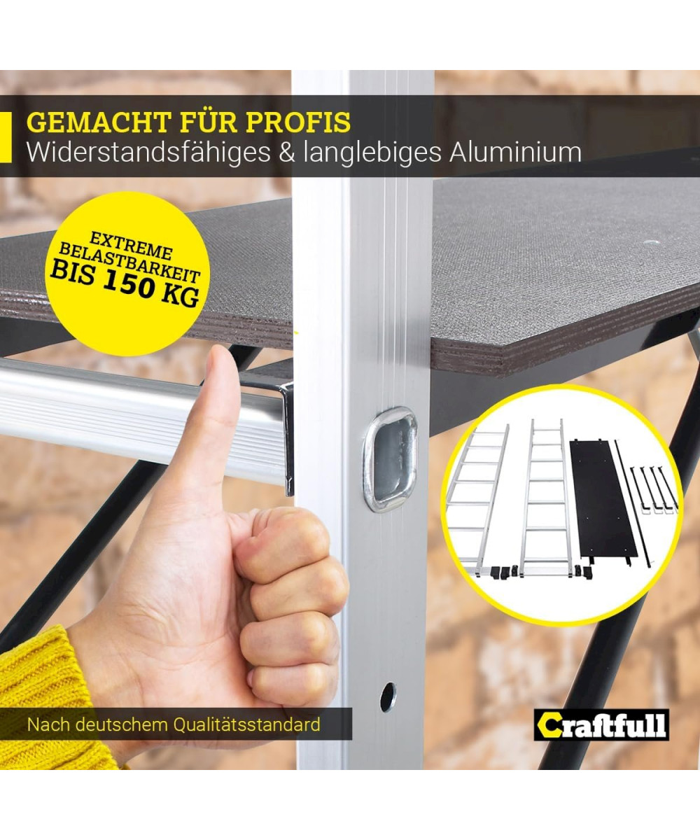 Bislang haben Sie schon viele Leitern ausprobiert, von denen alle bei der Anwendung aber immer wieder zu schnell an ihre Grenzen gestoßen sind? Nun wollen Sie eine funktionale Mehrzweckleiter kaufen, die sicher, flexibel und sehr bedarfsgerecht zu verwenden ist? Dann treffen Sie mit dem 4in1 Craftfull CF-103A Leitergerüst eine exzellente Wahl. Sie müssen sich nicht zwischen einem Rollgerüst, einer Klappleiter oder Anlegeleiter entscheiden: Mit dem Craftfull Leitergerüst CF-103A können Sie alle Funktionen mit nur einem Arbeitsgerät mit wenigen Handgriffen nutzen. Sie sind daher mit diesem multifunktionalen Leitergerüst für alle handwerklichen Arbeiten daheim oder auf einer Baustelle perfekt ausgerüstet. Wie Sie es von Craftfull erwarten dürfen, so steckt auch bei diesem Leiter-Gerüst funktionaler Mehrwert in Details. Mit dem Craftfull Leitergerüst CF-103A lässt sich auch in der Höhe eine sichere Arbeitsfläche nutzen. Angesichts dessen eignet sich diese Multifunktionsleiter für Hobbyhandwerker ebenso wie für Experten. Eloxiertes Aluminium erweist sich als leichte, aber dennoch sehr belastbare Materialbasis (bis zu 150 kg Tragkraft). Besonders praktisch ist, dass sich die Leiter ebenfalls als Arbeitsbühne nutzen lässt.