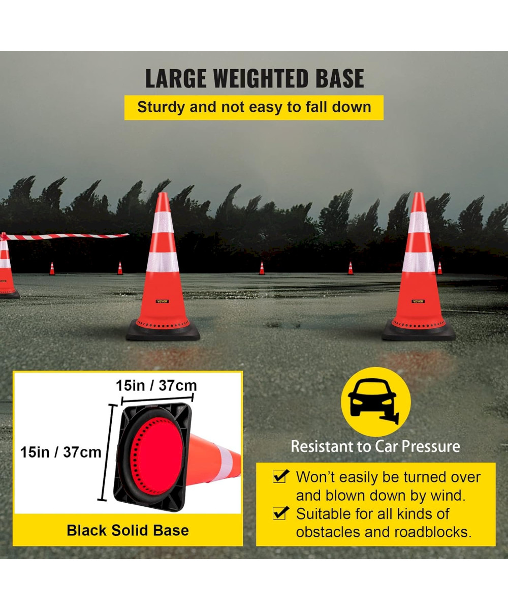 Unsere Verkehrskegel sind äußerst langlebig und können nicht so leicht vom Wind umgeweht werden. Der Grund dafür ist, dass die 15 x 15 Zoll (37 x 37 cm) große, beschwerte Basis so stabil ist und den Elementen im Freien lange standhält.