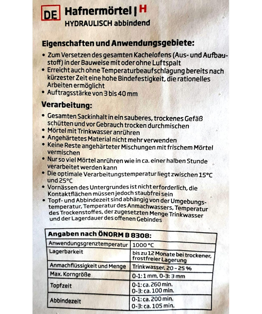 Hydraulisch abbindend. Zum Mauern und Verputzen des gesamten Kachelofens oder Kamins