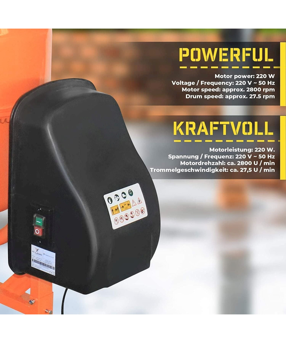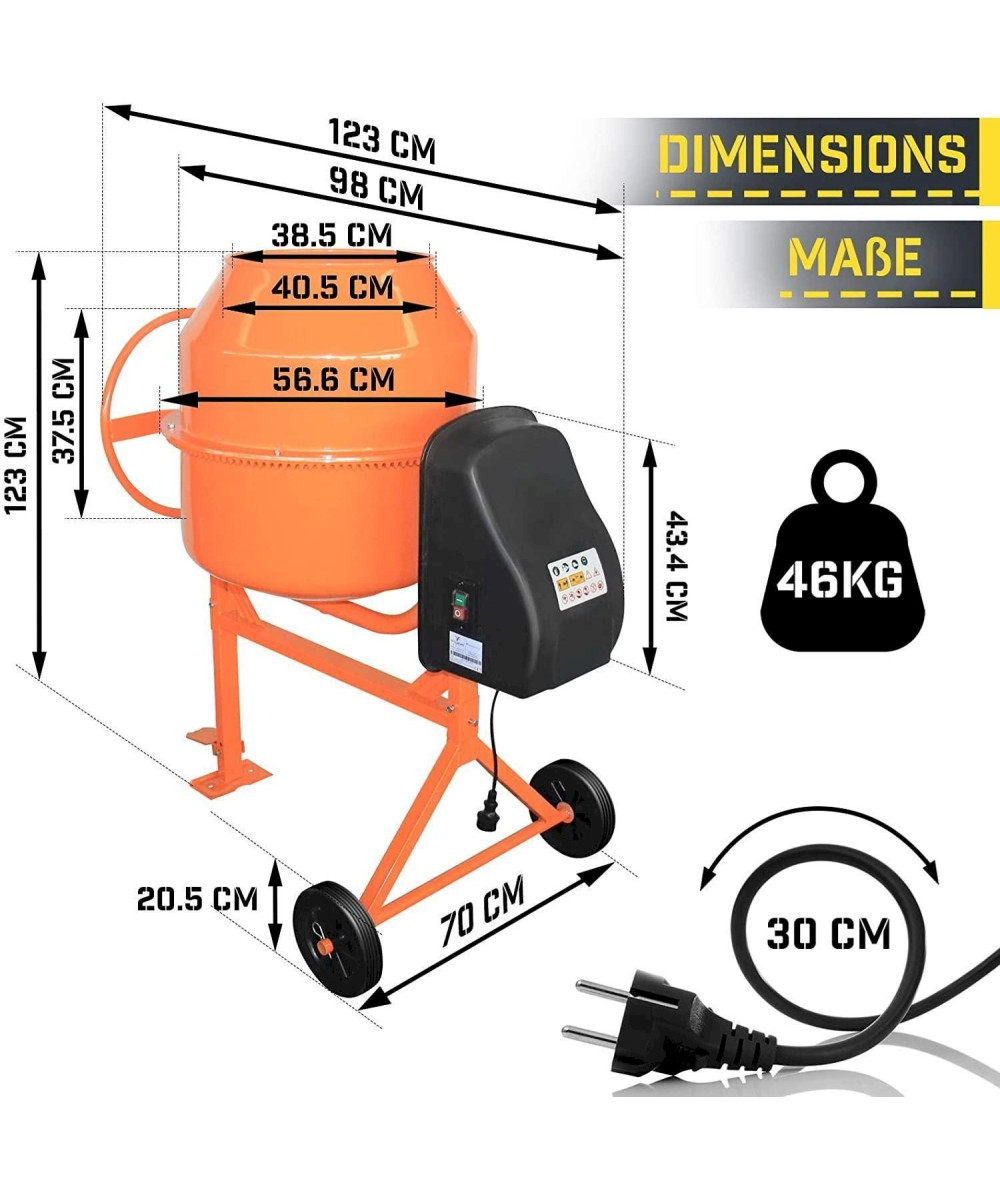 Unser Betonmischer für den Amateur- und Profibereich ist leistungsstark und robust und ermöglicht das Mischen von Zement, Zusatzstoffen und Wasser in jedem Mengenverhältnis. Die transportierbare Mischmaschine verfügt über eine 140-Liter-Trommel, die sich dank eines 550-Watt-Einphasen-Elektromotors dreht, ein Kipprad, das die Einstellung der Neigung und des Ausgießens ermöglicht, sowie eine robuste Stahlkonstruktion mit 2 Rädern für den bequemen Transport und die ideale Bedienung.