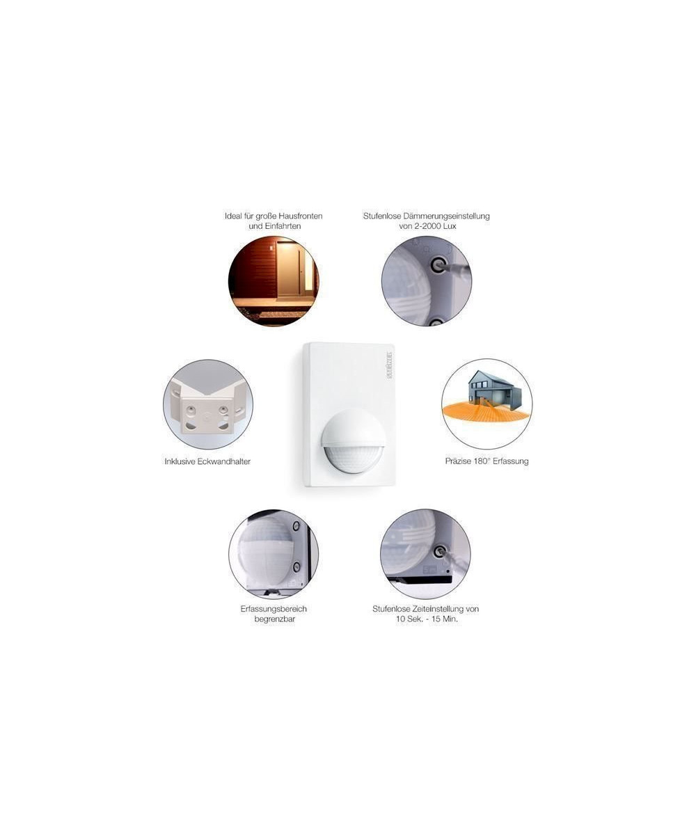 Infrarot-Bewegungsmelder IS 180-2, für außen und innen, ideal für große Hausfronten und Einfahrten, Eckmontage mit Eckwandhalter möglich, 180° Erfassungswinkel, Reichweite einstellbar bis 12 m oder bis 5 m, Zeit- und Dämmerungsschwelle einstellbar, durch Abdeckblenden einschränkbarer Erfassungsbereich.Zwei in speziellem Winkel zueinander angeordnete, hochempfindliche Infrarotdetektoren ermöglichen die zuverlässige und lückenlose Überwachung auch großer Bereiche bis 200 m.