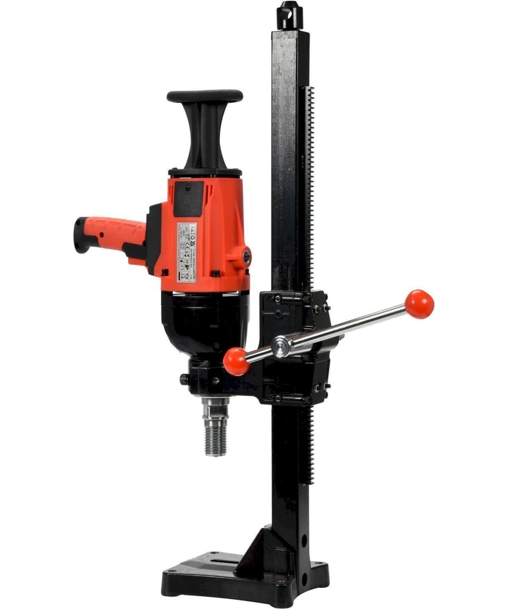 Das Gerät wird komplett mit einem Stativ und einem Getriebe geliefert, wodurch das Bohren in harte Materialien wie Granit oder Beton ohne Kraftaufwand möglich ist.