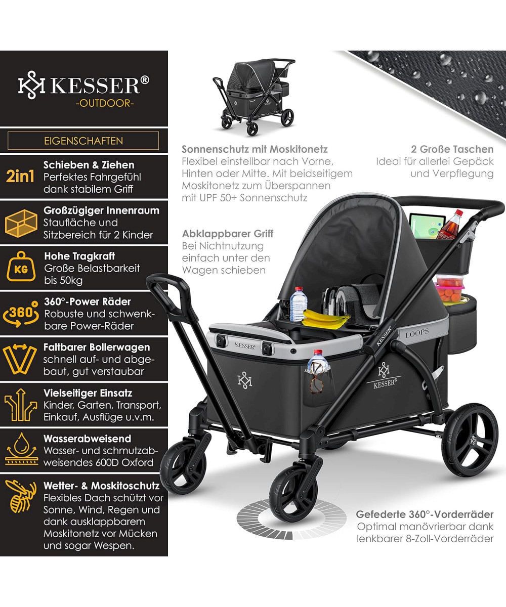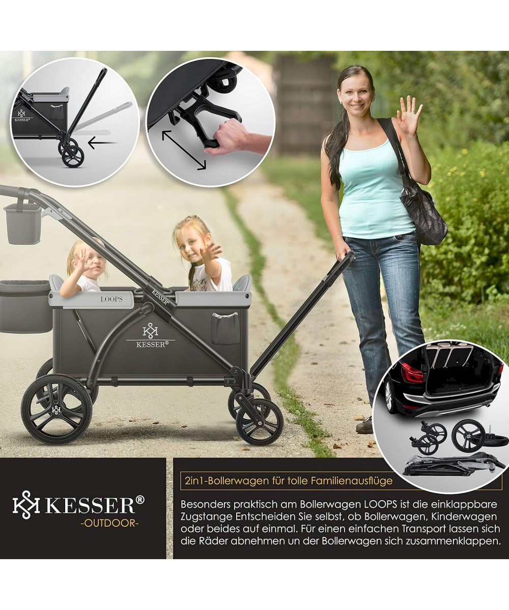 Neben den integrierten Taschen und diversen Aufbewahrungstaschen, ist der hochwertige Bollerwagen mit zwei ergonomischen Griffen zum Ziehen oder Schieben, sowie zwei gefederten 360° drehbaren 8-Zoll-Vorderräder versehen. Dadurch können Sie unseren Bollerwagen zusätzlich auch als idealen Kinderwagen nutzen. Der hochwertig verarbeitete LOOPS Bollerwagen lässt sich mit nur sehr wenigen Handgriffen schnell aufbauen und auch wieder zusammenklappen. Dank des intelligenten Faltsystems, lässt sich der Bollerwagen der Marke KESSER, im Handumdrehen zu einer kompakten Größe von nur 75cm x 39cm x 53cm zusammenfalten und lässt sich somit unkompliziert transportieren und einfach in Ihrem Kofferraum verstauen. Zudem können Sie die Reifen per Knopfdruck lösen um so noch mehr Platz zu sparen.