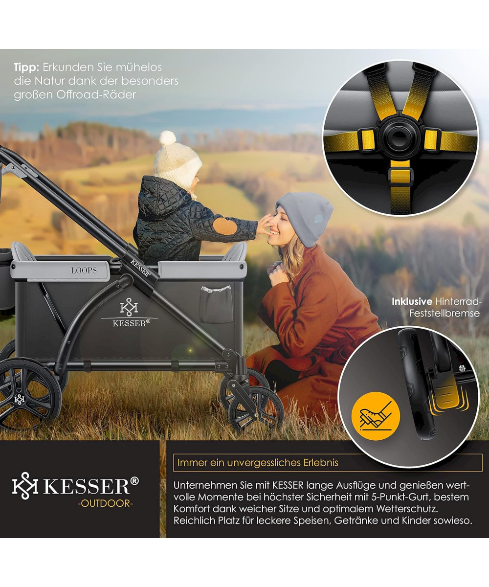 Profitieren Sie von optimaler Sicherheit und einem ruhigen Gewissen, dank der Zwei 5-Punkt-Sicherheitsgurt-Systeme im KESSER Bollerwagen LOOPS. Ihre Kinder sitzen komfortabel und sind bestens vor einem Fall aus dem Bollerwagen geschützt. Mit unserem Transportwagen genießen Sie wertvolle Momente bei höchster Sicherheit, bestem Komfort und optimalem Wetterschutz. Genug Platz für leckere Speisen, Getränke und viel Platz für die Kleinen. Zusätzlich sorgen die leistungsstarken Bremsen für die optimale Kontrolle bei der Fahrt! Gerade mit einem herkömmlichen Gartenwagen ist es im Gefälle schwer den Bollerwagen zu kontrollieren, unsere Bremsen sind für dieses Problem die optimale Lösung. Los gehts!