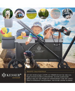 Unser Outdoor Trolley verfügt über einen abklappbaren Griff, welcher bei Nichtnutzung unter den Wagen geschoben werden kann und zwei um 360° drehbare Vorderräder. Das strapazierfähige Material und die stabile Rahmenkonstruktion bieten eine extrem hohe Tragfähigkeit von bis zu 50Kg, so können Sie den Handwagen schwer beladen und sind für jedes anstehende Abenteuer bestens vorbereitet. Der großzügige Innenraum bietet ausreichend Staufläche und einen Sitzbereich inkl. Sitzpolster für bis zu 2 Kinder, welchen Sie bei Bedarf in der Mitte falten können um noch weicher zu sitzen. Dank der herausnehmbaren Getränke- und Snackablage können Ihre Kinder problemlos Snacks, Getränke und Spielzeuge verstauen.