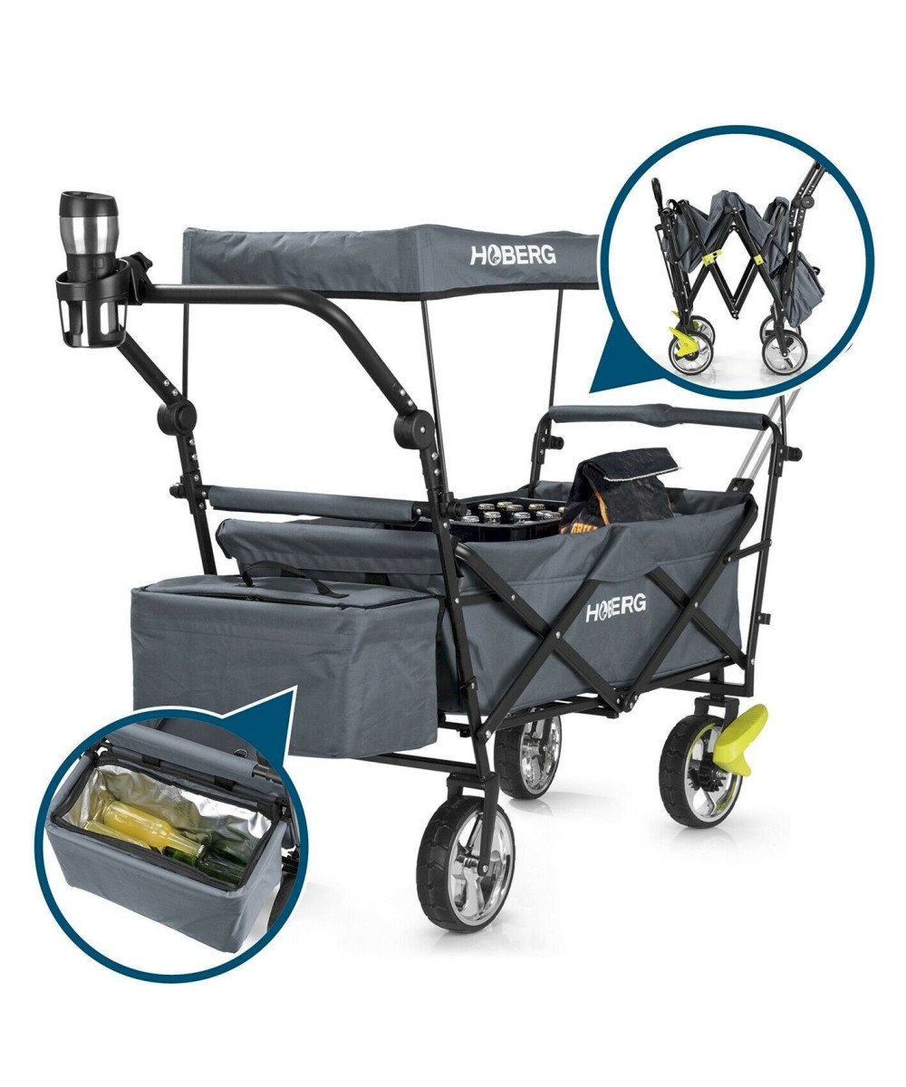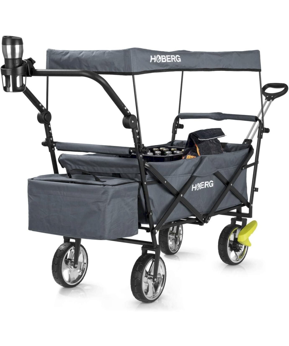 Der faltbare Bollerwagen von Hoberg ist dein idealer Begleiter für alle Ausflüge im Freien und ebenso schnell aufgebaut wie wieder platzsparend verstaut! Dank des stabilen Metallrohrrahmens und des robusten Nylonbezugs lassen sich damit bis zu 80 kg Gewicht transportieren - ideal für die eine oder andere Getränkekiste. Der Dachbezug schützt das Transportgut gleichermaßen vor Regen und Sonne. Die 360°-Drehgelenke an den Rädern machen den Bollerwagen besonders wendig, der ausziehbare Handgriff ermöglicht eine optimale Handhabung und die Feststellbremsen sichern den Wagen vor dem Wegrollen. Bei hohem Gewicht kann hinten noch mit dem Schiebegriff angeschoben werden. Inklusive Halterung für die dazugehörige Kühltasche. Wird er nicht mehr gebraucht, ist er schnell in der beiliegenden Aufbewahrungstasche verstaut - griffbereit für den nächsten Ausflug.