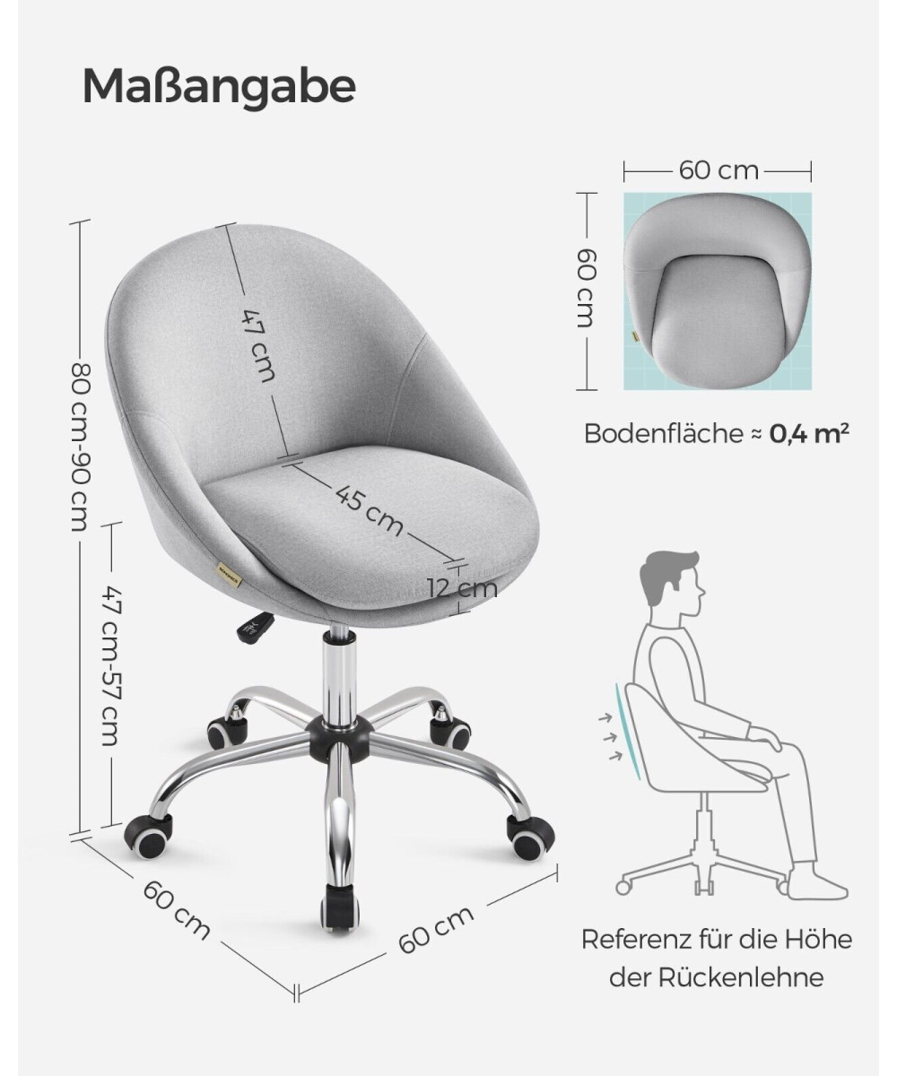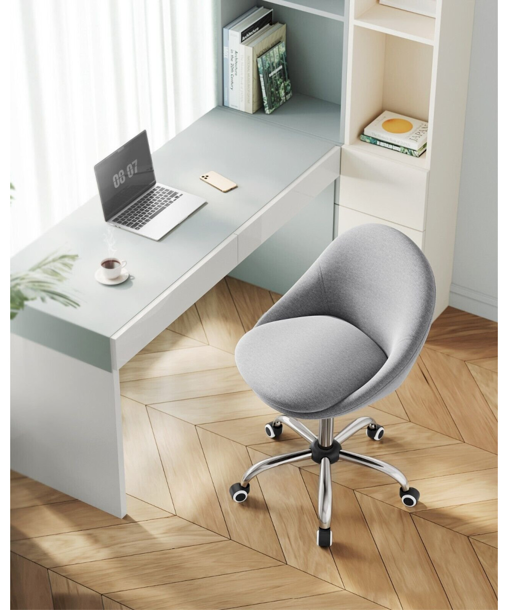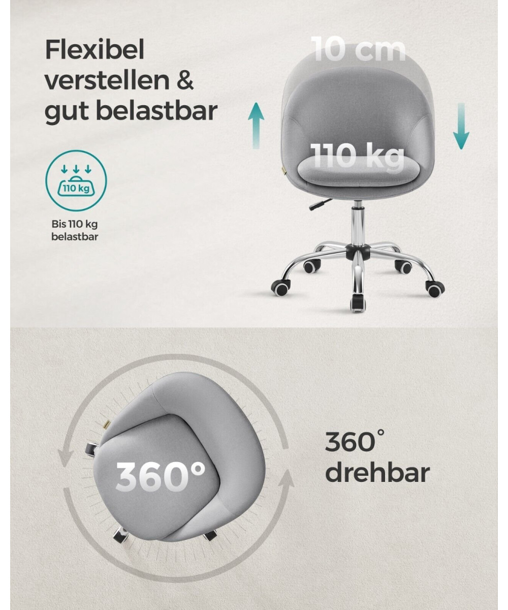 [Platzsparend] Dieser kompakte 360° drehbare Schreibtischstuhl (60 x 60 cm) ist um 10 cm höhenverstellbar und hat keine Armlehnen. Bei Nichtgebrauch können Sie den Stuhl unter den Schreibtisch schieben, um Platz zu sparen