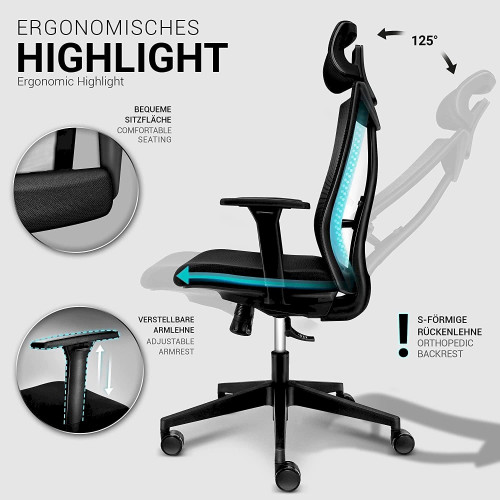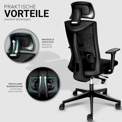 Unser Bürostuhl besitzt eine mehrfach verstellbare Kopfstütze . Zusätzlich kann die Lordosenstütze individuell angepasst werden , sodass Rückenschmerzen vermieden werden. Hierzu wird eine aufrechte Haltung beibehalten und die Muskulatur entlastet.