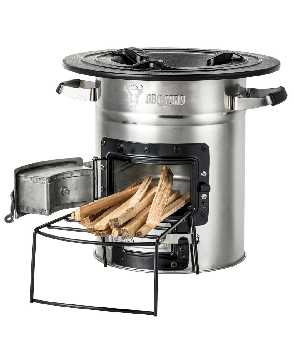 Der Raketenofen verfügt über zwei Öffnungen mit Türen, um zum Einen die Rakete zu befeuern und zum anderen können Sie die Luftzufuhr regulieren. Im Lieferumfang befindet sich ein Brennholzgestell mit dem Sie größere Holzstücke von unten nachschieben können. Die praktische 3-Punkt-Topfhalterung gibt Ihrem Dutch Oven oder Ihrer Gusspfanne einen optimalen halt. Zusätzlich ist der Raketenofen mit komfortablen Edelstahlgriffen mit Gummierung ausgestattet. Die Griffe lassen sich auch beim heißen Ofen noch anfassen.