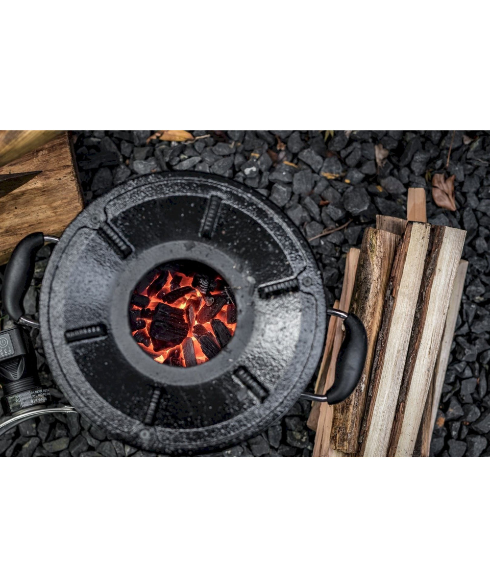 Die Nutzung im Freien ist auch bei windigem Wetter gar kein Problem. Dank dem Kamineffekt (Luftzug von unten) wird das Holz effektiv verbrannt. Die Flammen steigen durch eine Öffnung in der Mitte des Ofens bis zum gusseisernen Ring. Diese einzigartige Konstruktion hat viele Vorteile. Zum Einen ermöglicht es eine vollständige Verbrennung der Materialien - es ist eine nahezu geruchlose, rauchfreie Flamme ohne Funkenflug - und zum Anderen kann die entweichende Hitze zum Kochen genutzt werden.