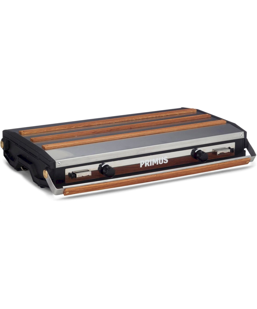 Der Primus Kocher Tupike ist ein komfortabler Zweiflammkocher, der mit herkömmlichen Schraubkartuschen betrieben wird. Mit dem Tupike Stove gibt es endlich einen komfortablen Kocher für das Familiencamping, ohne dass schwere Gasflaschen mitgenommen werden müssen. Die Zündung erfolgt mit integrierten Piezozündern und die präzise Feinregulierung erfolgt erfolgt über griffige Drehregler an der Front. Mit dem passenden Zubehörkit lässt sich der Tupike jedoch auch mit den großen Butan und Butan/Propan-Gasflaschen betreiben. Das ist eine Option für lange Urlaube oder Basecamps. Das Gehäuse des Tupike ist aus Edelstahl mit schützenden Eichenholzeinlagen gefertigt, andere Bauteile sind aus Messing, so dass Primus durch die Materialwahl einen hochwertigen und langlebigen Kocher kreiert hat. Der ausklappbare Windschutz sorgt für komfortables Kochen auch unter widrigen Bedingungen und auf der im Lieferumfang befindlichen Grillplatte aus Aluguss lassen sich Fleisch, Fisch und Gemüse perfekt grillen. So steht einer perfekten Outdoormahlzeit beim Camping nichts mehr im Weg.