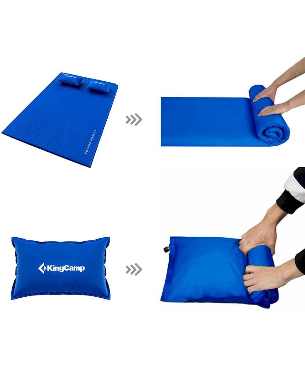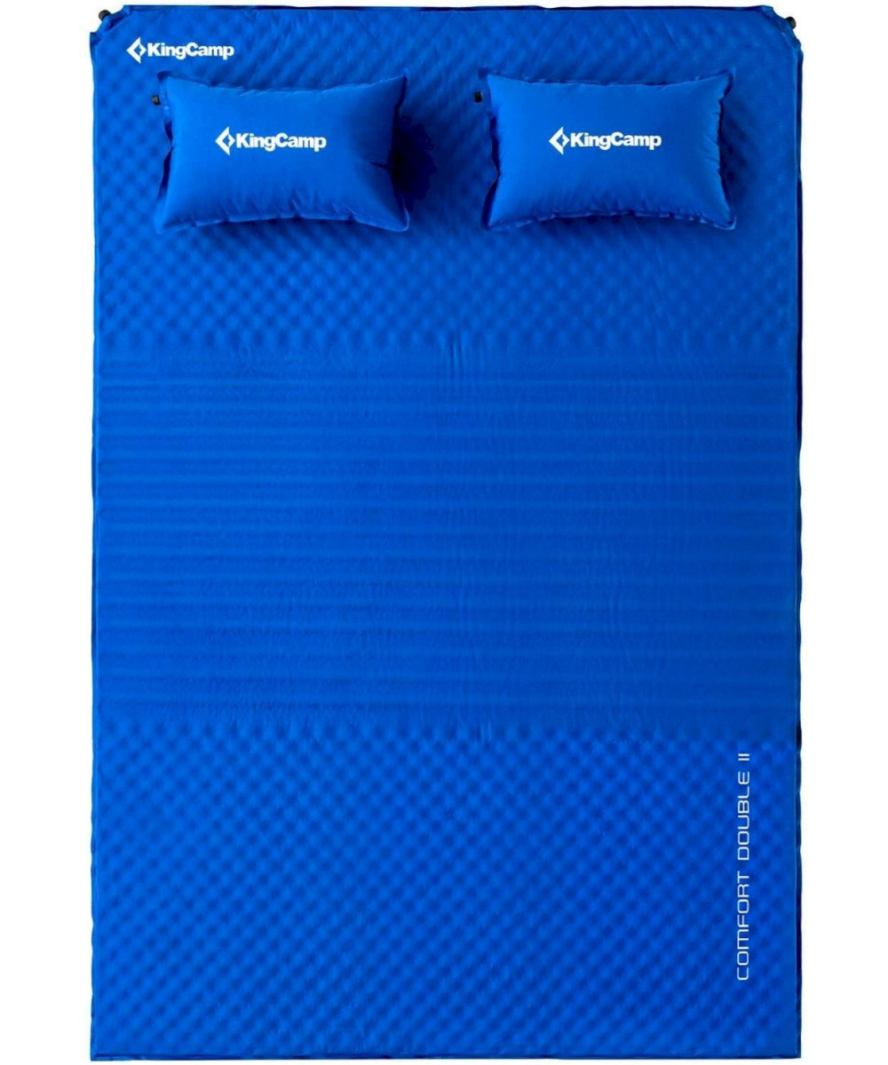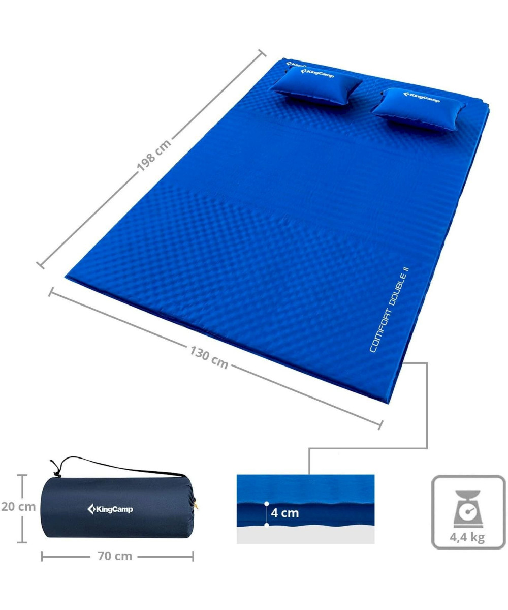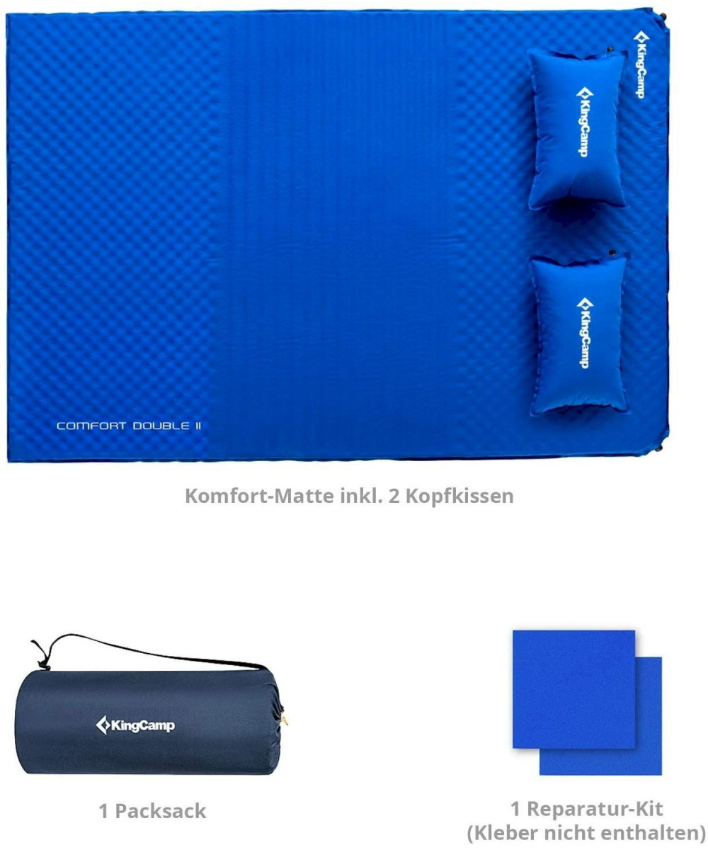 Mit der Comfort Double II präsentiert KingCamp eine selbstaufblasende 2-Personen-Isomatte inklusive Kissen. Die Isomatte ist aus extra robustem 75D Polyester gefertigt und mit einer rutschfesten Unterseite versehen. Die Zwei-Wege-Ventile aus Messing garantieren ein schnelles Aufblasen und Entlüften.