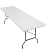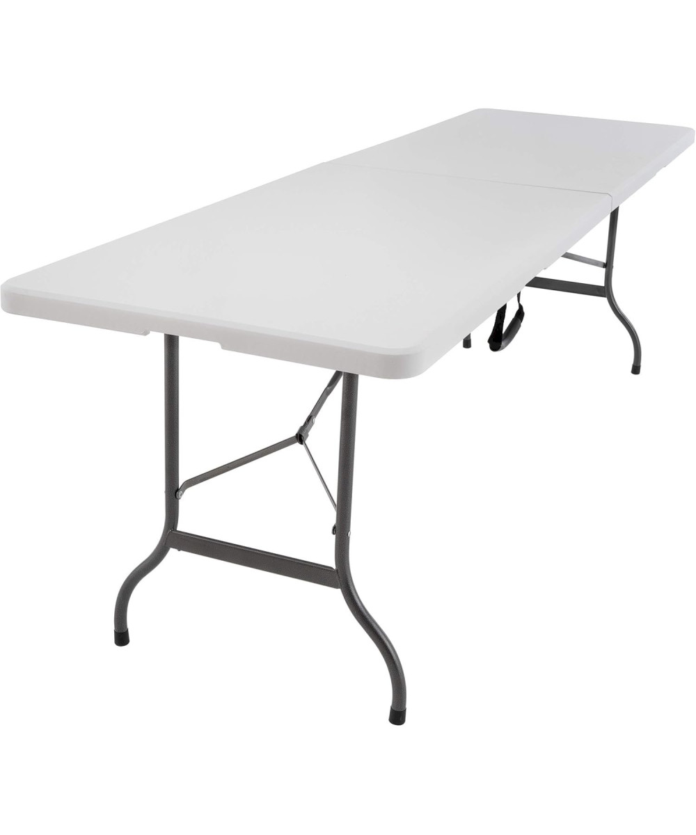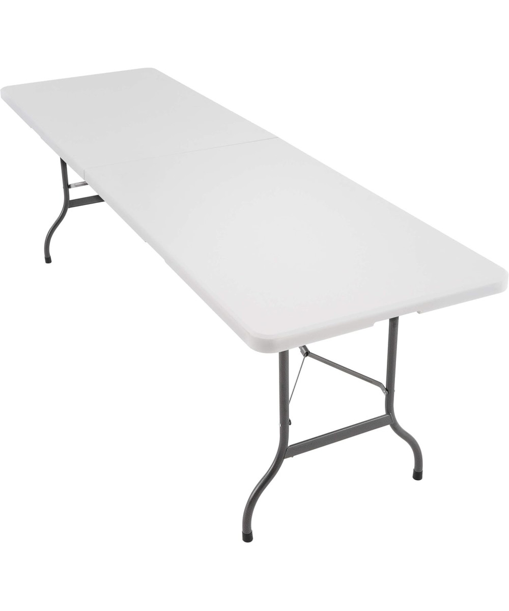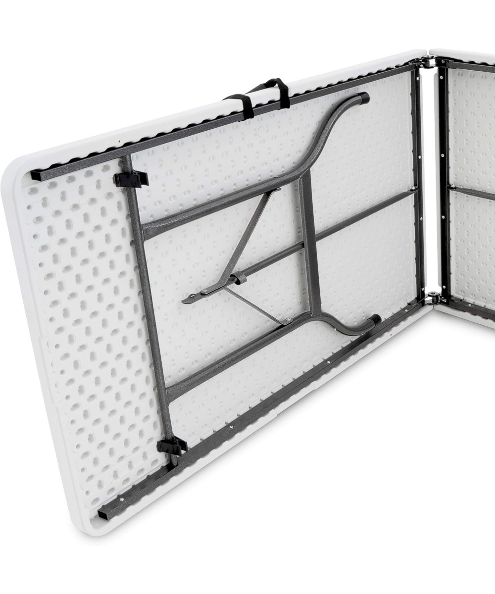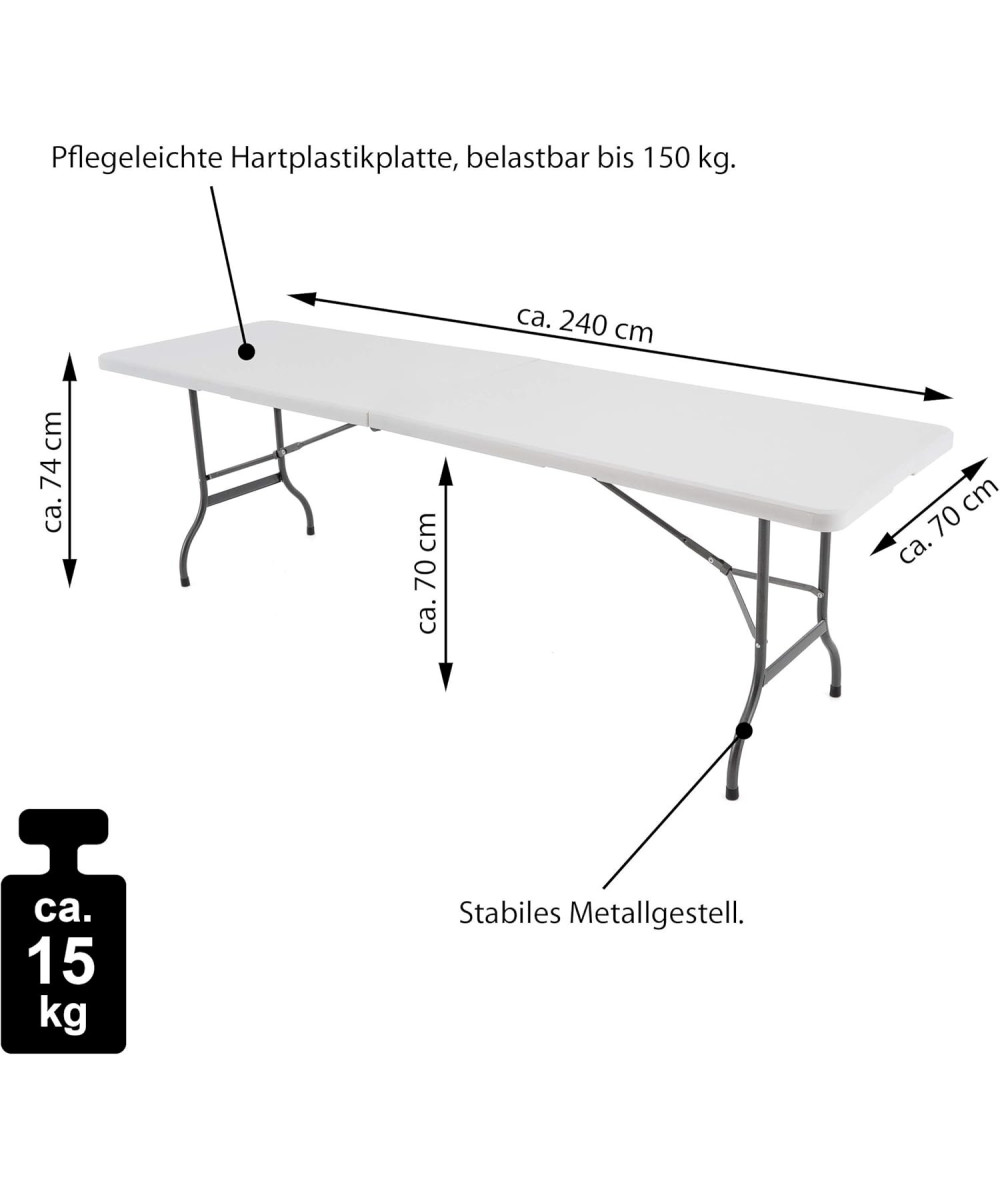 Großer XXL Klapptisch 244 x 75 x 72 cm mit pflegeleichter Hartplastikplatte und stabilem Metallgestell. Der Partytisch eignet sich hervorragend als Esstisch, sowohl innen als auch außen, und bietet bequem Platz für 8 – 10 Personen.