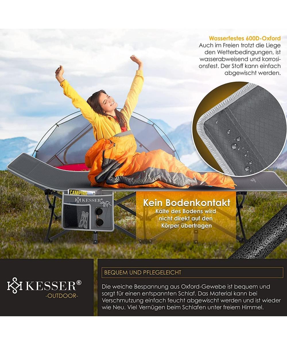 Das KESSER Campingbett Premium ist ein hochwertiges Feldbett, das speziell für den Einsatz im Freien entwickelt wurde. Mit einer angenehm weichen und rutschfesten Bespannung aus Oxford-Gewebe ist es besonders bequem und einfach zu pflegen. Die wasserabweisende Oberfläche ermöglicht es, das Bett schnell und einfach abzuwischen und zu reinigen - so liegen Sie auch nach einem kurzen Regenschauer im trockenen.
