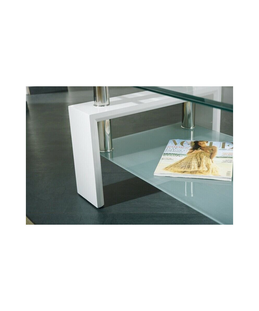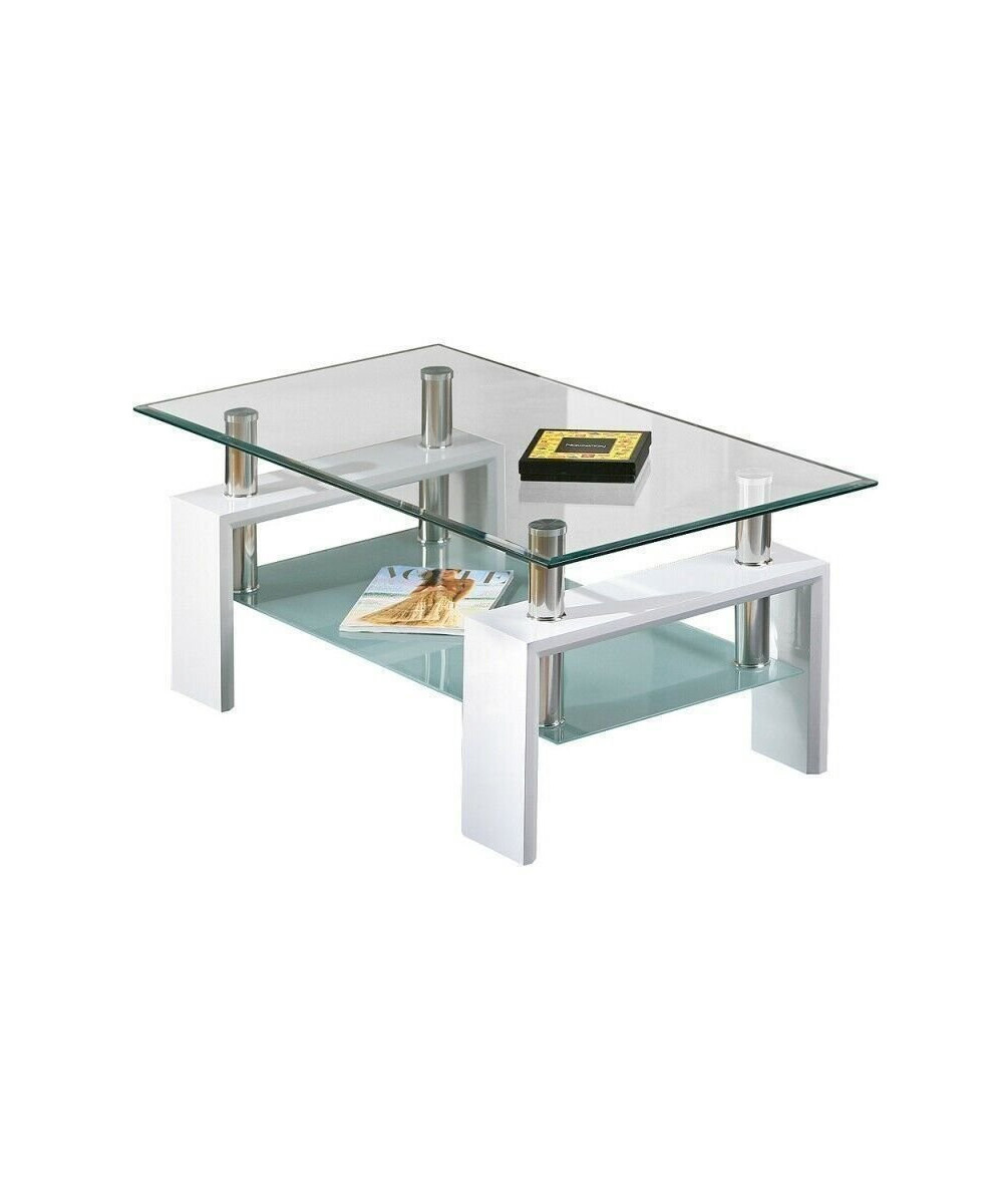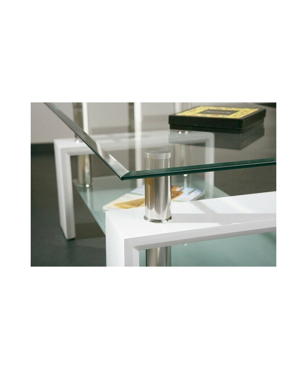 Der Couchtisch Alva ist die ideale Ergänzung für Ihr Wohnzimmer. Das neutrale Design fügt sich ideal in vorhandene Einrichtungsstile ein und erregt dennoch die Aufmerksamkeit ihrer Gäste! Geniales Design: Das weiße MDF Gestell hält vier verchromte Metallrohre welche zwei Sicherheitsglasplatten verbinden. Diese ausgefallene Konstruktion verleiht dem Couchtisch einen einzigartigen Charakter. Die untere Ebene eignet sich hervorragend um Zeitschriften abzulegen.
