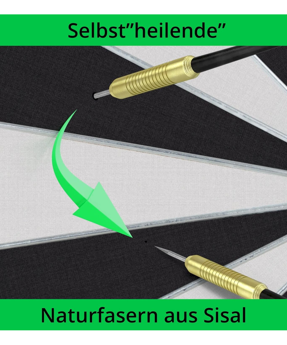 Die Turnierdartscheibe besteht aus der Naturfaser Sisal, welches zu Sisalborsten verarbeitet und anschließend in ca. 2,5 cm dicke Scheiben geschnitten wird. Dadurch, dass die Borsten sich immer wieder nach Entfernen des Pfeils neu ausrichten, wird ermöglicht, dass die Metallspitzen der Dartpfeile jedes Mal gleich gut stecken bleiben. Der vorhandene drehbare Nummernring hilft dabei, die Lebensdauer der Dartscheibe zu verlängern. So kann, wenn eine besonders begehrte Fläche stark beansprucht ist, einfach die Scheibe und der Ring gedreht werden und die Dartpfeile halten wieder wie am ersten Tag.