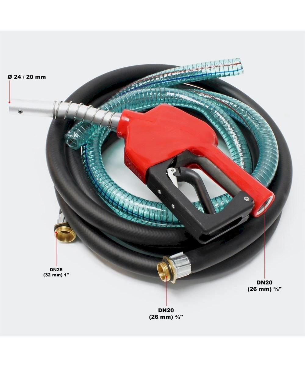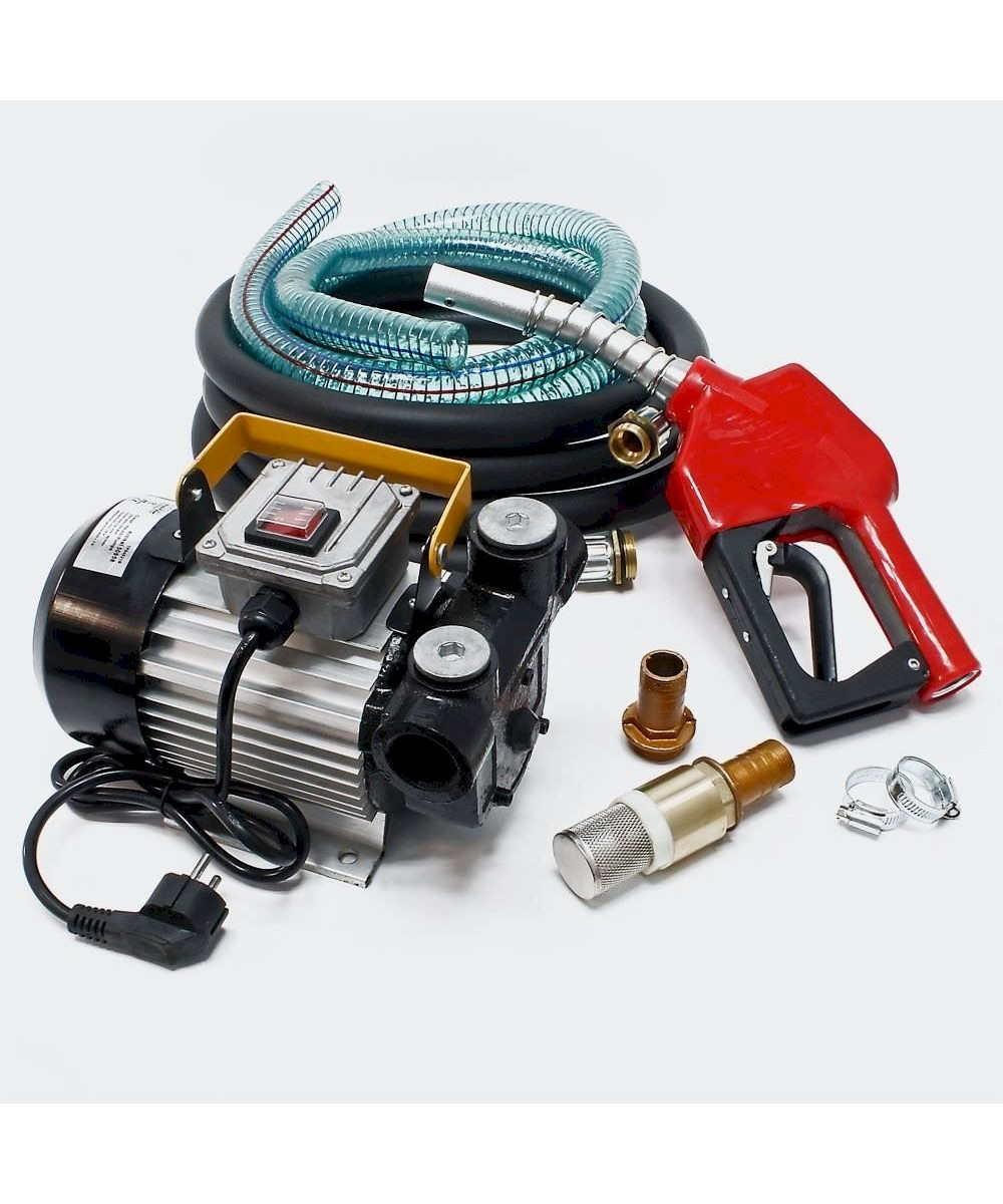Die selbstansaugende 230V Dieselpumpe mit Schläuchen und Zapfpistole für den sofortigen Einsatz.