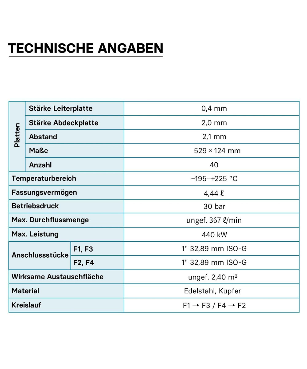 (*)⚠️Da diese Wärmetauscher bislang noch nicht nach der Druckgeräterichtlinie 97/23 EG geprüft sind, beträgt die Druckfreigabe für Europa bis auf weiteres 0,5 bar. Die oben gemachten Angaben sind Angaben des Herstellers.