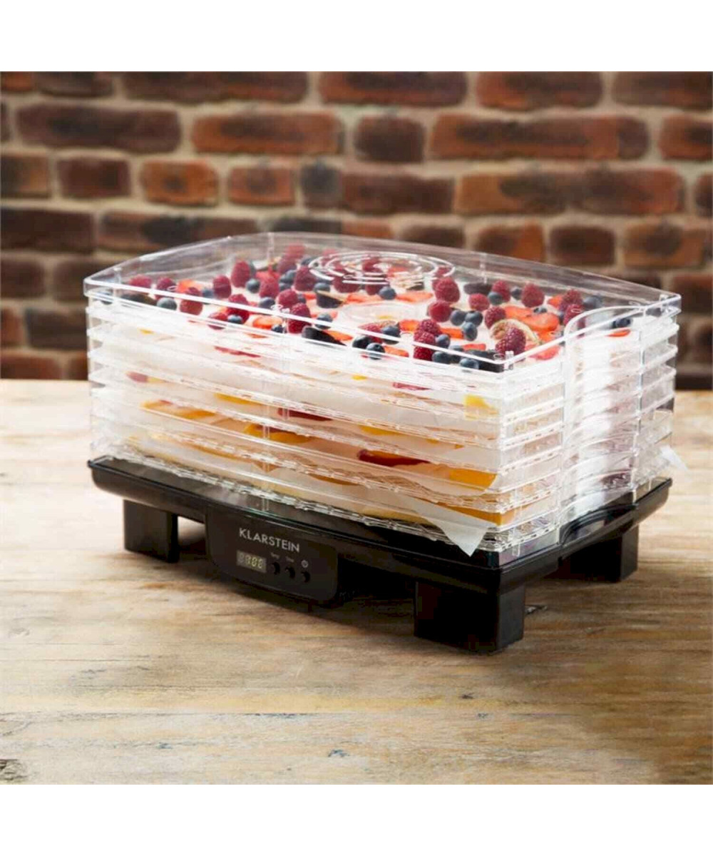 Der leistungsstarke Dehydrator von Klarstein trocknet Obst, Gemüse, Fleisch und andere Lebensmittel im Rekordtempo aus und stellt damit leckere, haltbare Snacks und Zutaten her. Ob vitaminreiches Trockenobst wie Apfel- und Bananenchips oder gesundes Gemüse wie getrocknete Tomaten - jeder Geschmack wird vom Klarstein Bananarama souverän bedient.