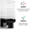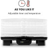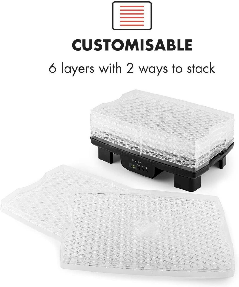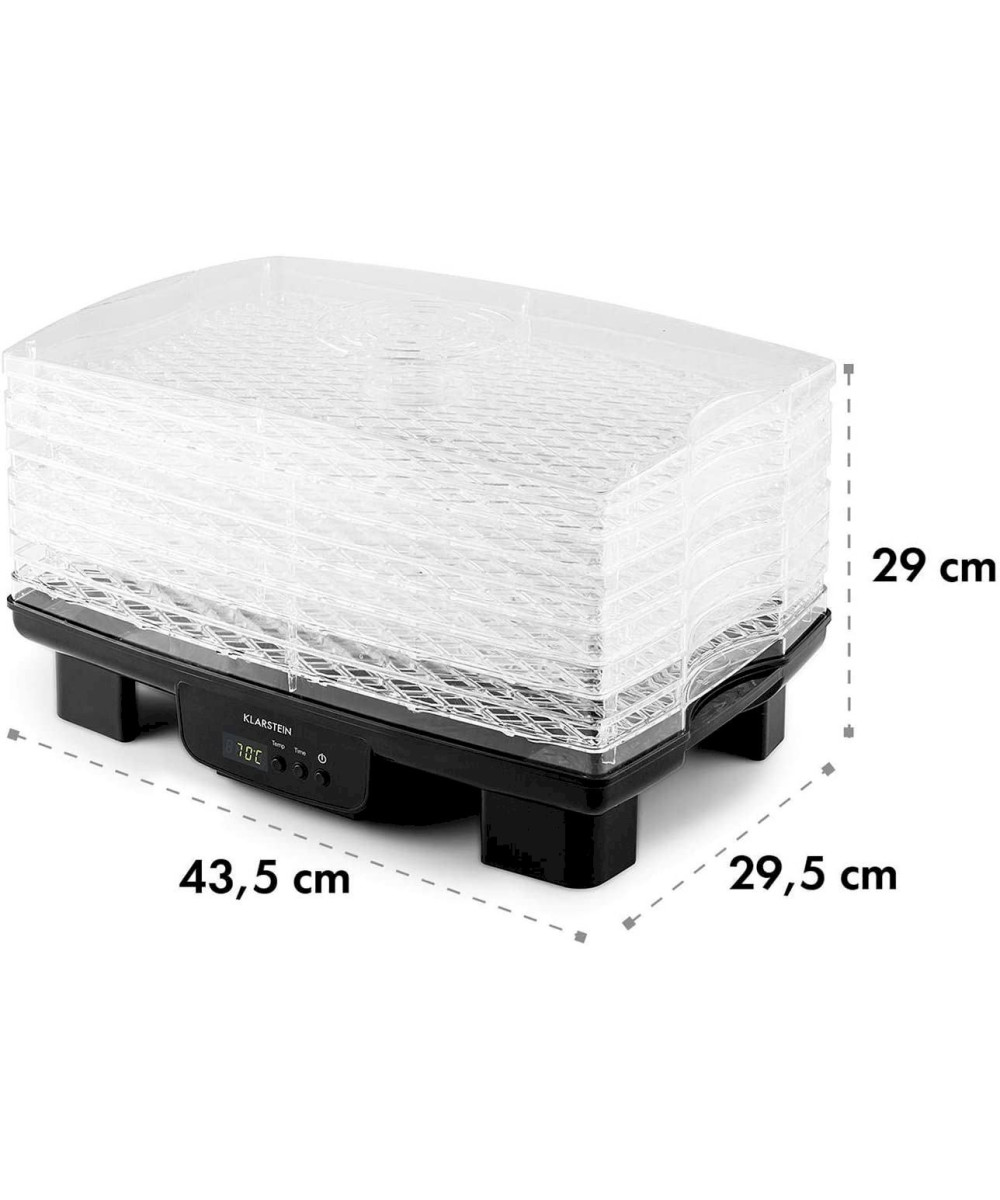 Mit 550 Watt Heizleistung sorgt der Dörrautomat dafür, dass kein Wasser in den Lebensmitteln zurückbleibt. Die komplette Trocknung verlängert die Haltbarkeit der Lebensmittel auf natürliche Weise und erhält dabei Vitamine, Ballaststoffe sowie andere wertvolle Inhaltsstoffe ohne Verluste. Ganz wie bei der Paleo-Diät geht es um die artgerechte Ernährung mit viel Gemüse, hochwertigen Tierprodukten und Obst um sich dadurch schlank, leistungsfähig und überdurchschnittlich gesund zu ernähren. Der kräftige Motor verkürzt die Trocknungsdauer im Vergleich zu anderen Geräten deutlich, ohne Einbußen in der Qualität hinterlassen. Für die flexible Zubereitung unterschiedlicher Lebensmittel, ist der Temperaturbereich von 40 - 70° C einstellbar. Der einstellbare Timer erleichtert die Nutzung und beendet den Trocknungsprozess zum eingestellten Zeitpunkt vollautomatisch.