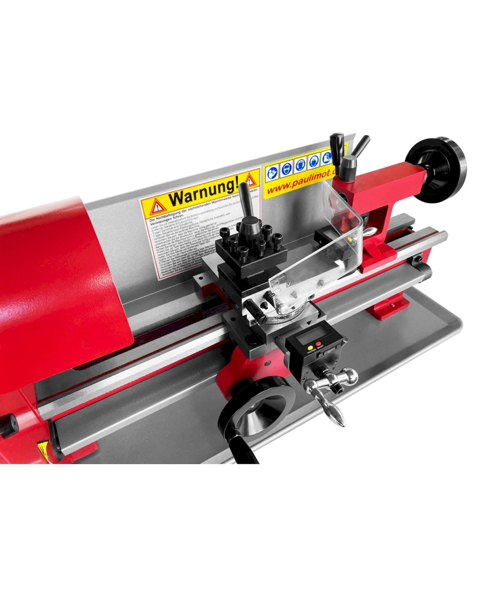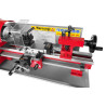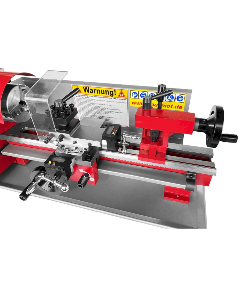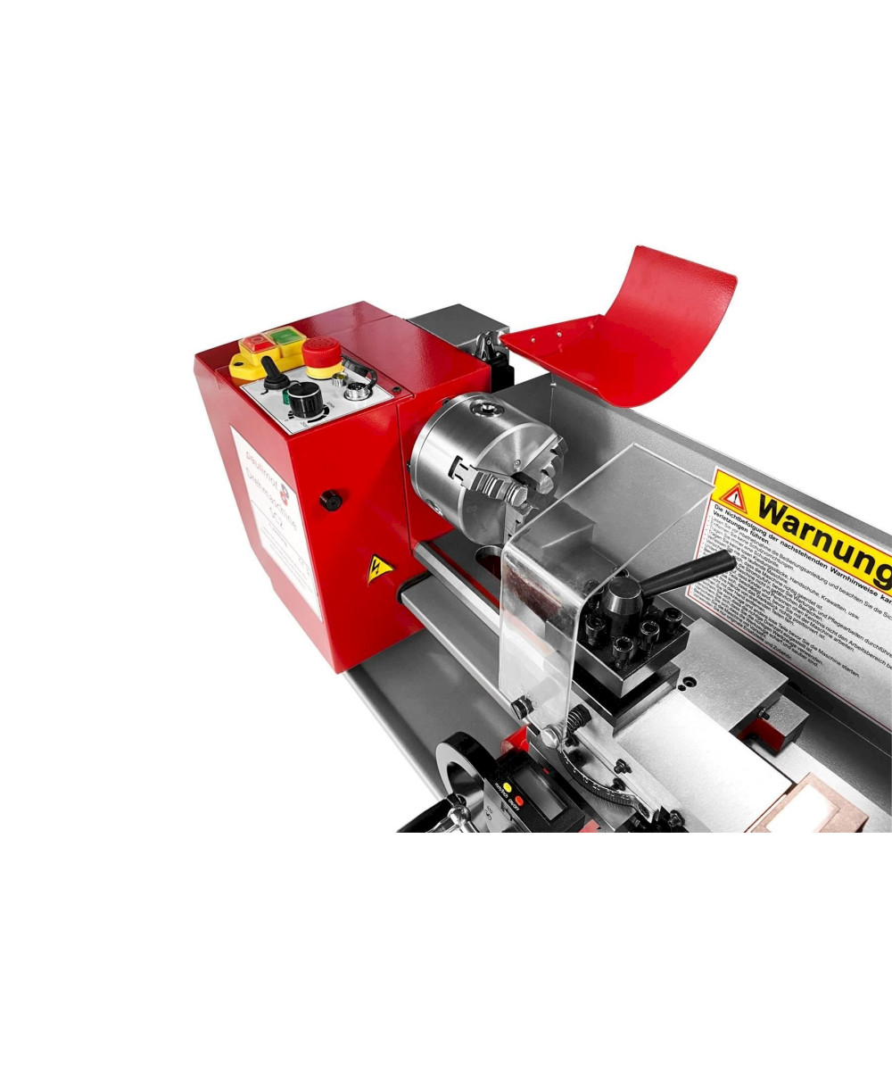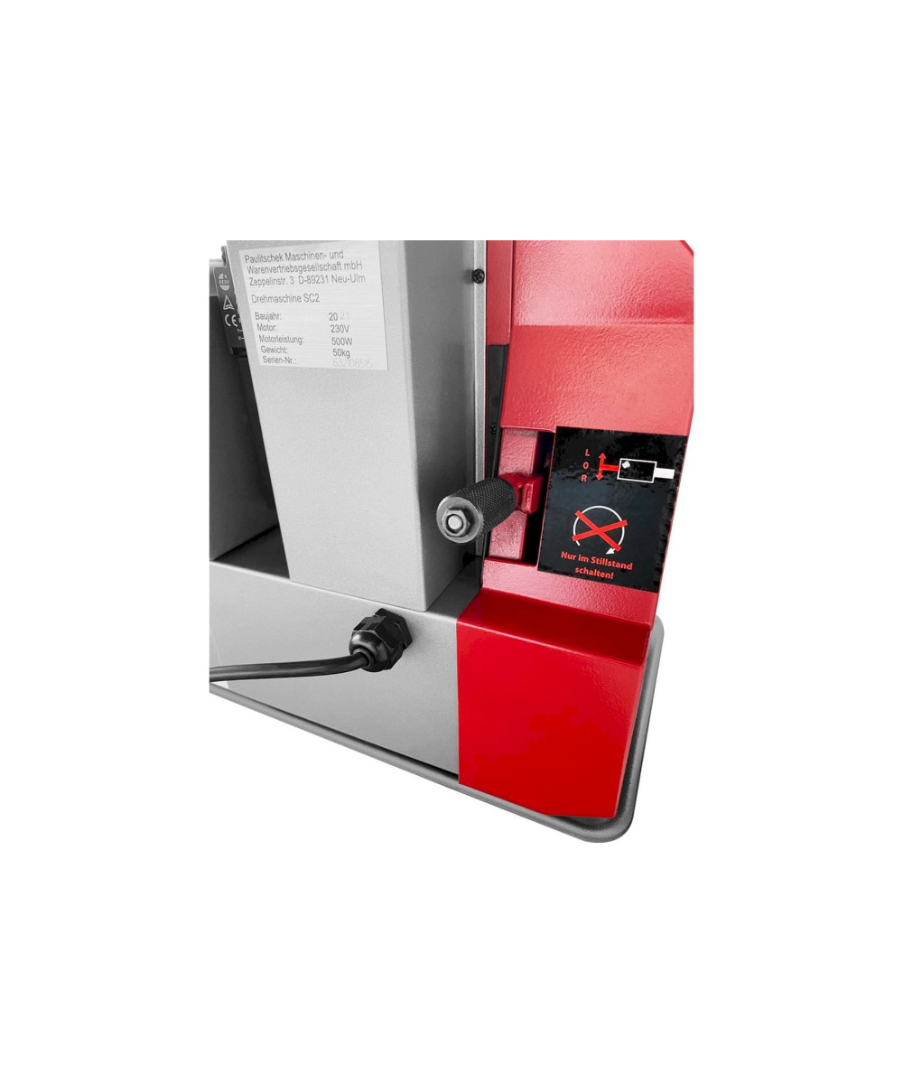 Bei der SIEG SC2 handelt es sich um eine 230-Volt-Tischdrehbank mit variabler Drehzahlregulierung. Sie wird über einen kraftvollen, bürstenlosen Gleichstrommotor mit einer Abgabeleistung von 500 Watt angetrieben. Die dynamische Steuerung sorgt für ein hohes Drehmoment in allen Drehzahlen. Sie regelt automatisch nach, um die vorgegebene Drehzahl zu halten. Der Drehzahlbereich der SC2 reicht von 100 bis 2.500 U/min. Der gesamte Drehzahlbereich wird mit einer Riemenstellung abgedeckt. Die Maschine verfügt über einen Längsvorschub zum Gewindeschneiden. Durch ein Wendeherz kann die Drehrichtung der Leitspindel unabhängig von der Drehrichtung des Drehfutters umgestellt werden. Somit können mit dieser Maschine Linksgewinde hergestellt werden. Auf dem Bedienfeld befinden sich der Drehzahlregler, der Kippschalter für die Drehrichtung der Hauptspindel, der Schalter für START und STOPP und der Not-Halt-Taster. Die SC2 ist serienmäßig mit digitalem Nonius (umschaltbar zwischen mm und Inch) am Quer- und Oberschlitten ausgeführt. Durch die im Lieferumfang enthaltenen Wechsel-Zahnräder aus Stahl lassen sich zehn metrische Gewindesteigungen von 0,4 bis 2,0 Millimeter erzielen. Die SC2 kann optional mit einer digitalen Drehzahlanzeige ausgerüstet werden, der Anschluss hierfür ist bereits vorhanden.
