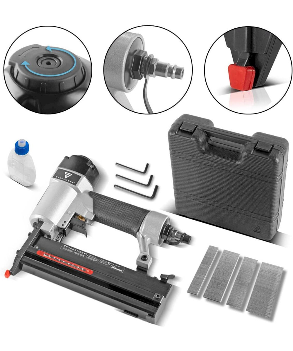 - Der STAHLWERK Druckluft Nagler DN-50 ST eignet sich mit einem Arbeitsdruck von 5-7 Bar ideal zum professionellen Einbringen von Nägeln und Tackernadeln mit einer Größe von 18 Gauge (1,25 x 1,05 mm).