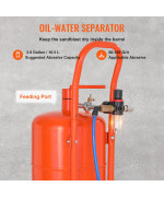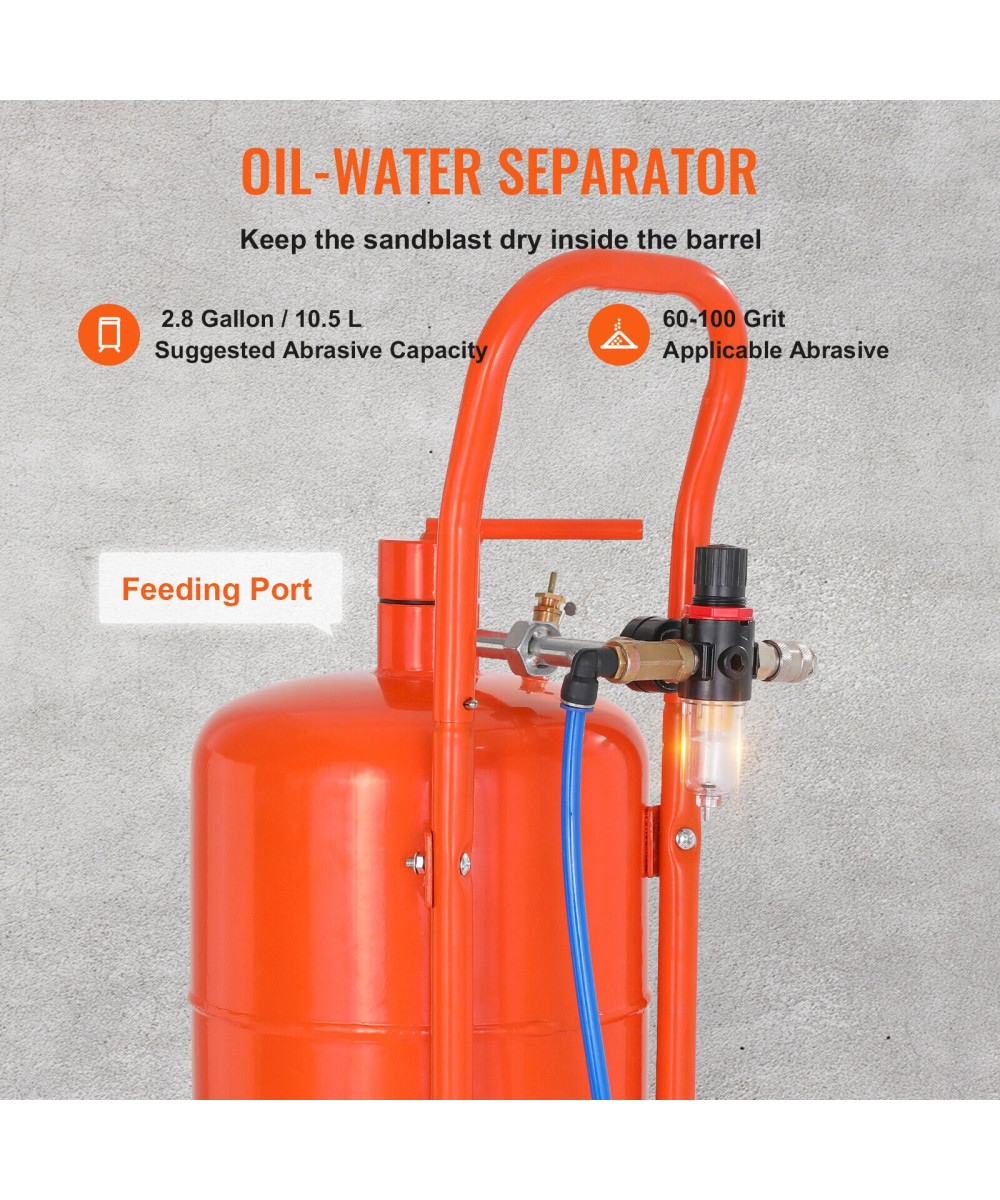 Fließt reibungslos und verhindert Verstopfungen: Der Sandstrahler von VEVOR ist mit einem Wasser-Öl-Abscheider mit Manometer ausgestattet, der effektiv Feuchtigkeit aus der Druckluft entfernt und verhindert, dass nasse Medien das Ventil verstopfen. Wir empfehlen eine Schleifkapazität von 2,8 Gallonen / 10,5 L perfekt für Schleifmittel der Körnung 60–100 wie Quarzsand, Aloxit, Glasperlen und mehr.