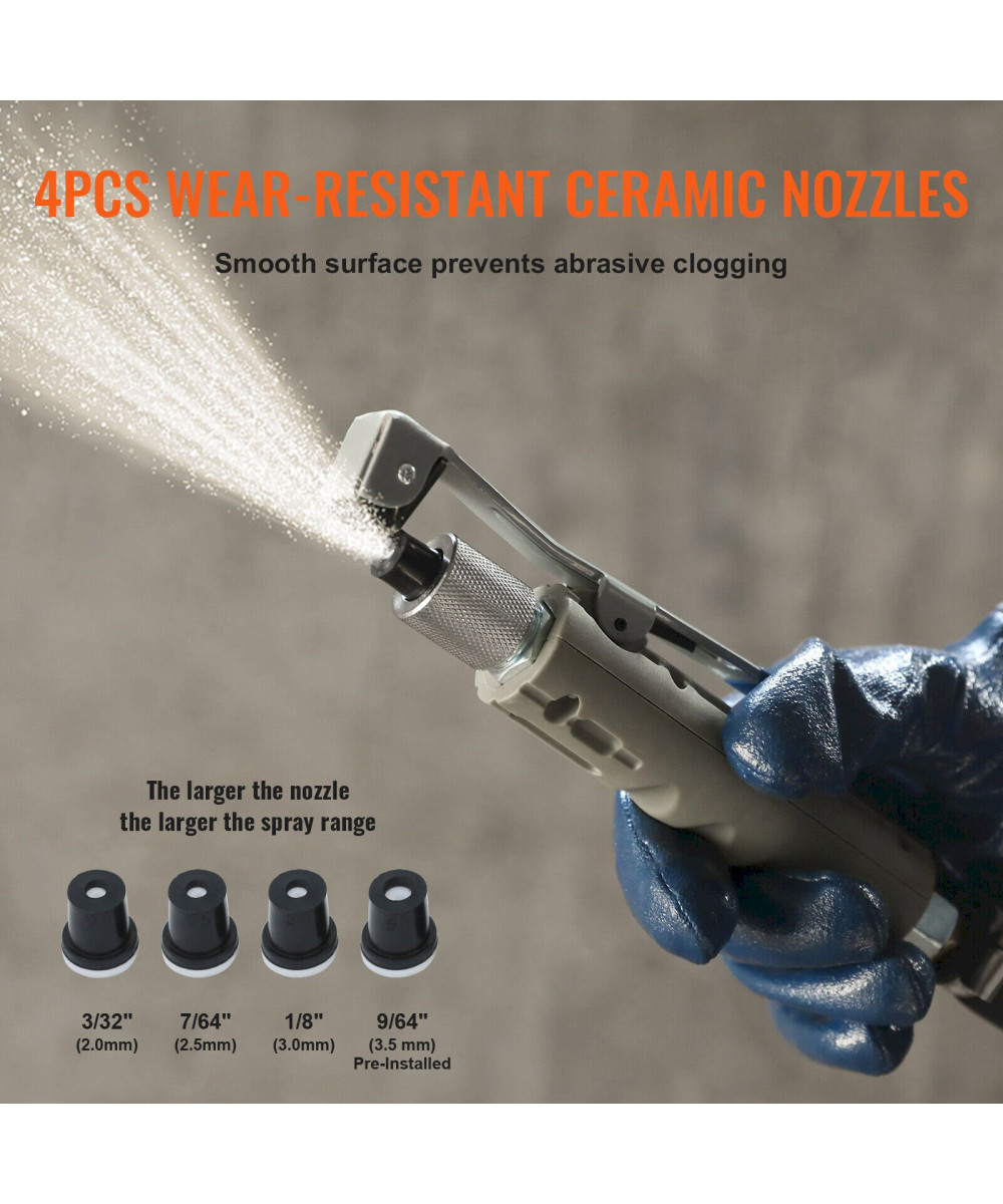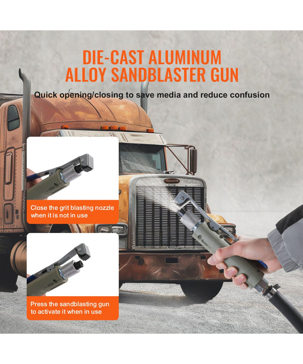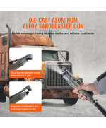 Verbesserte Sandstrahlpistole: Wir haben die herkömmliche Sandstrahlpistole mit Messingkugelhahn mit einer Sandstrahlpistole aus Aluminiumdruckguss aufgerüstet. Sie ist leichter, langlebiger und einfacher zu steuern. Es ermöglicht außerdem ein schnelles Öffnen und Schließen, um Medien zu sparen und Verwirrung zu vermeiden.