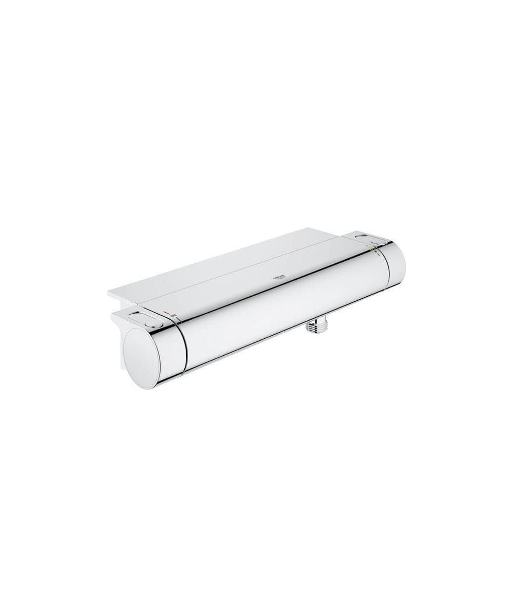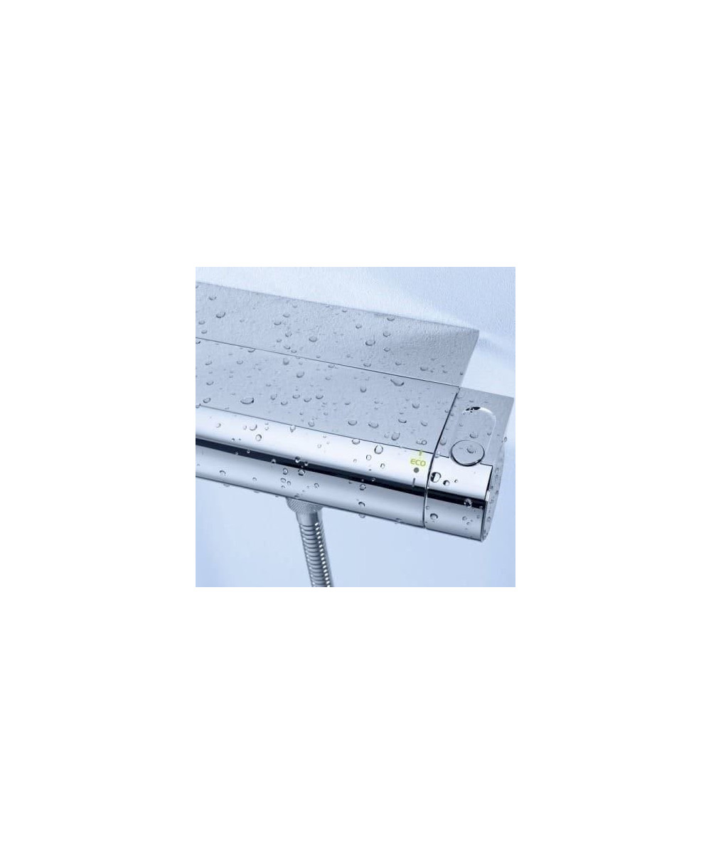 Diese Brausebatterie verbindet die Funktion thermostatisch abgesicherten Duschens mit ästhetischem Design. Die Bedienelemente sind angenehm handlich und intuitiv zu regeln. Zum Schutz Ihrer empfindsamen Haut werden durch die GROHE CoolTouch Technologie ein Aufheizen der Armaturenoberfläche und durch die SafeStop Taste ein versehentliches Einstellen zu heißer Wassertemperaturen verhindert. Die GROHE EasyReach Ablage auf der Armatur ist nicht nur formschön und leicht zu reinigen, sie hält Ihre Pflegeprodukte für Sie immer griffbereit. Dass Sie mit diesem Thermostat auch noch den Wasserverbrauch bei voller Leistung um bis zu 50 % zu reduzieren können, macht Duschen zu einem rundum unbeschwerten Vergnügen.