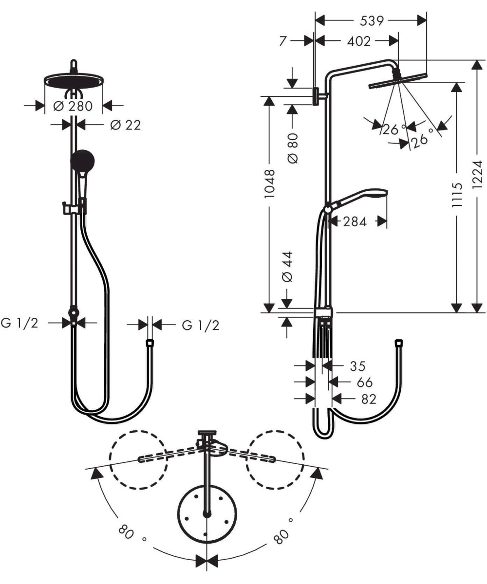 - Ausladung Duscharm: ca. 400 mm, Durchmesser Kopfbrause: 280 mm