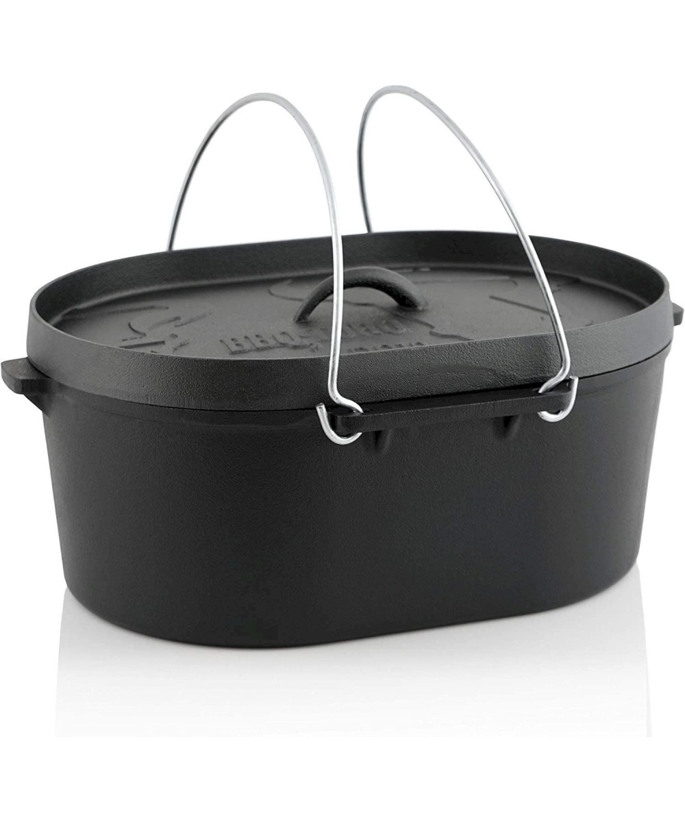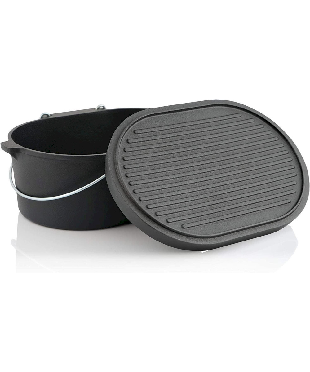 Der Dutch Oven ist ein schwerer, traditioneller, gusseiserner Topf und ein exakt passender Deckel mit dem man überall kochen, braten, schmoren, frittieren, dünsten und backen kann. Der Dutch Oven reguliert dank seiner hohen Masse (Gusseisen) ungleichmäßige Hitze und ermöglicht so ein gleichmäßiges Garen. Einfach glühende Kohlen, Glut oder Grillbriketts auf den Deckel und unter den Topf geben und das Dutch Oven-Erlebnis kann losgehen. Der extra erhöhte Deckelrand bietet optimale Bedingungen für Kohle und Co.