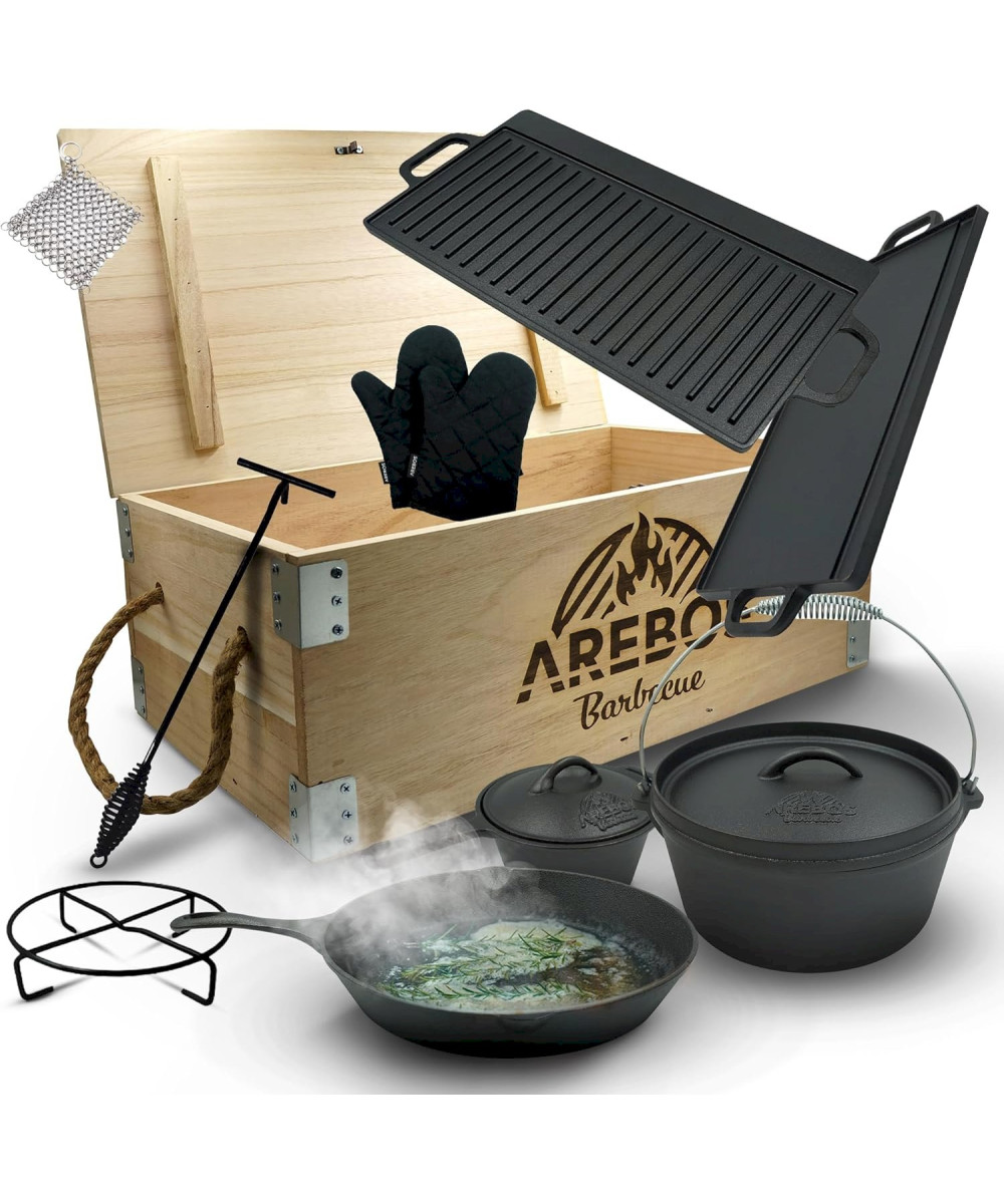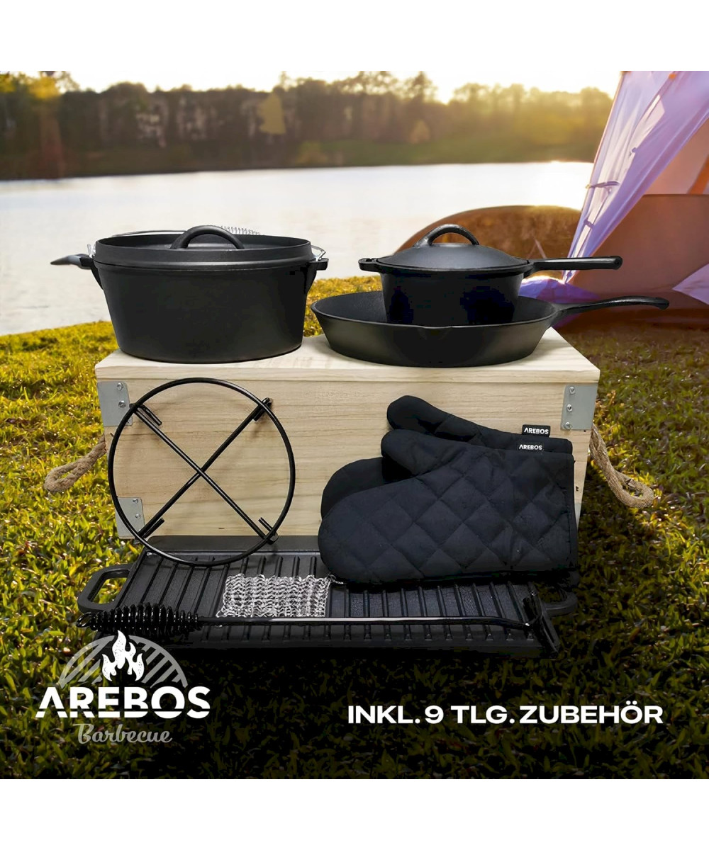 AREBOS Dutch Oven BBQ Set 9 tlg. in Holzkiste inklusive Schutzhandschuhe